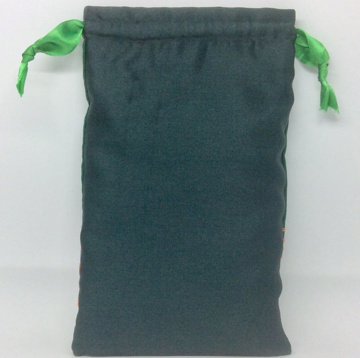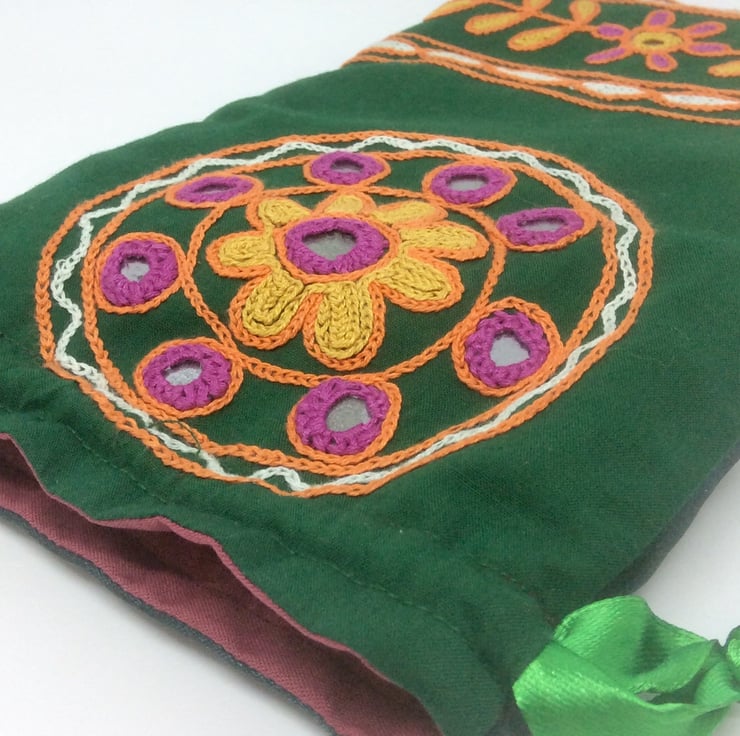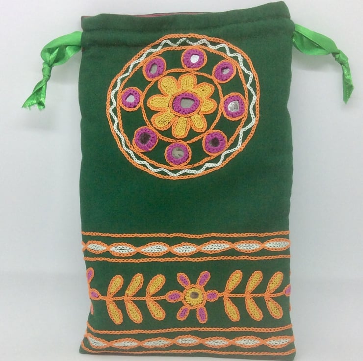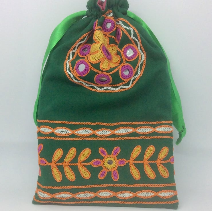 This attractive drawstring bag or Potli is one of a kind and would be unique to you. Perfect for a wedding or for any special occasion. The bag is made from a beautiful preloved garment. On the front the green cotton has colourful embroidery and is embellished with tiny mirrors. The reverse of the bag is a very dark green satin. It is lined with a dark pink cotton fabric and has a double drawstring closure of green ribbon. The bag measures approximately 24cm x 15cm.