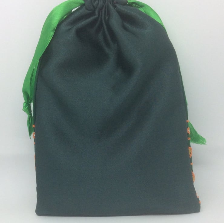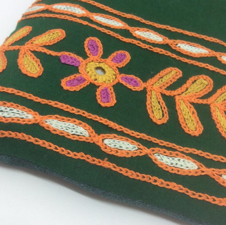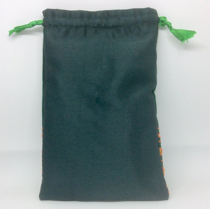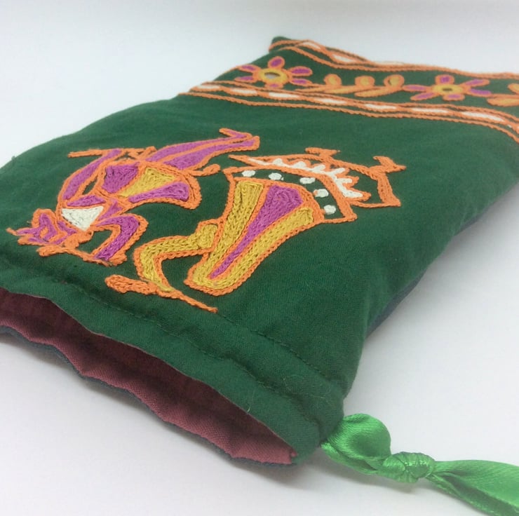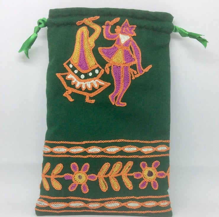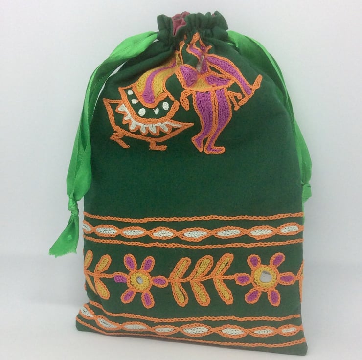 This attractive drawstring bag or Potli is one of a kind and would be unique to you. Perfect for a wedding or for any special occasion. The bag is made from a beautiful preloved garment. On the front the green cotton has colourful embroidery and is embellished with tiny mirrors. The reverse of the bag is a very dark green satin. It is lined with a dark pink cotton fabric and has a double drawstring closure of green ribbon. The bag measures approximately 24cm x 15cm.