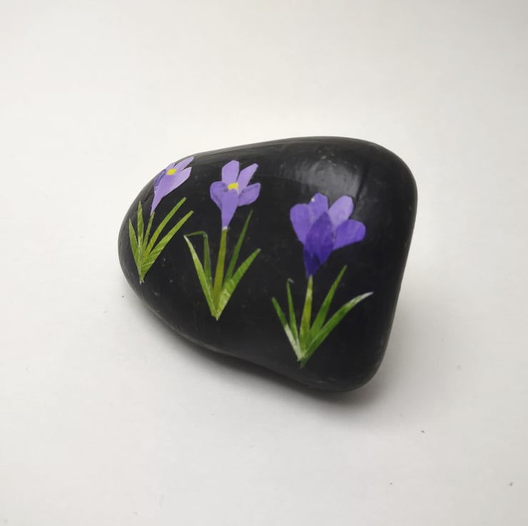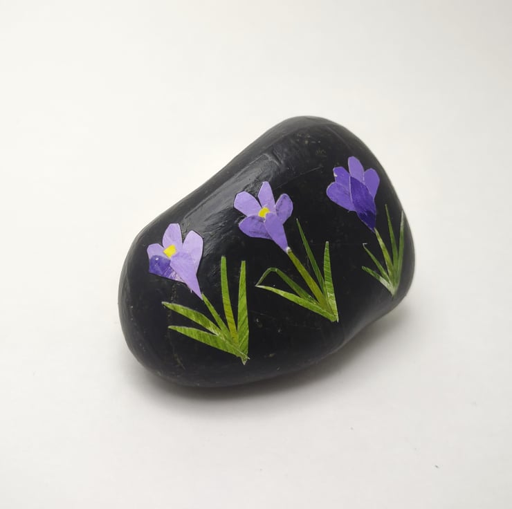 A painted rock with a twist. The art on this stone isn't painted on but is a collage. This pretty floral design features three beautiful purple crocuses. A perfect gift for a gardener, this decorated pebble would make an ideal paperweight or ornament.