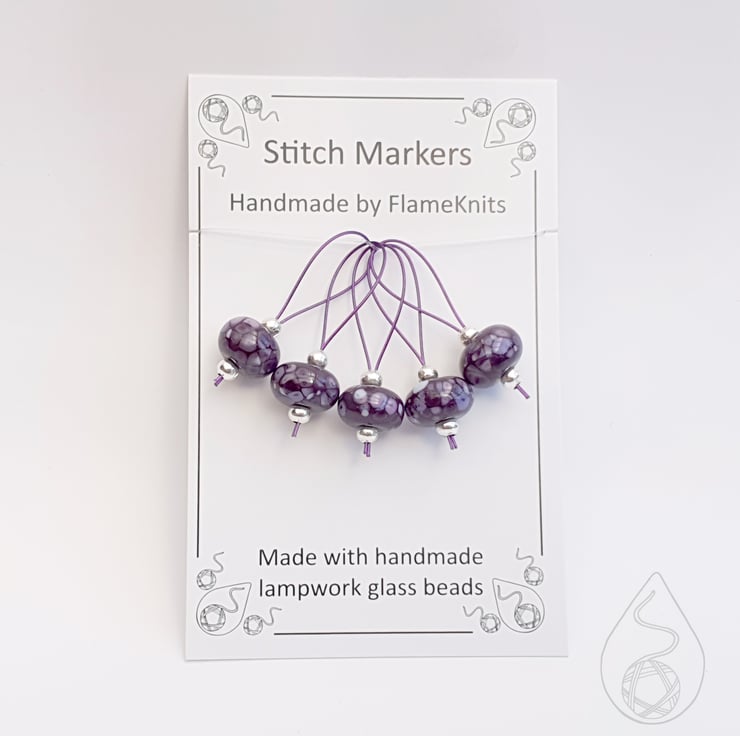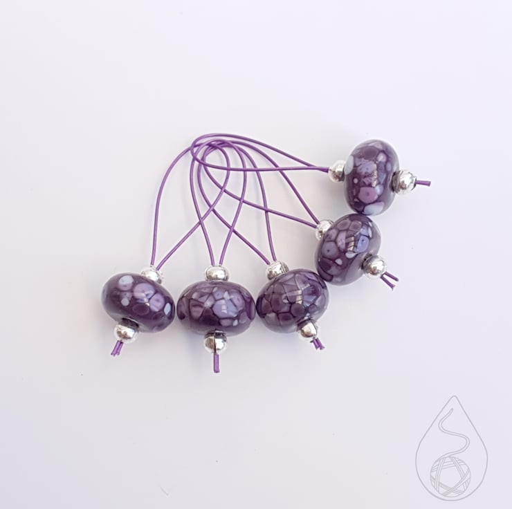 A set of 5 stitch markers made with lampwork glass beads in dark purple with delicate pink, lilac and blue details.