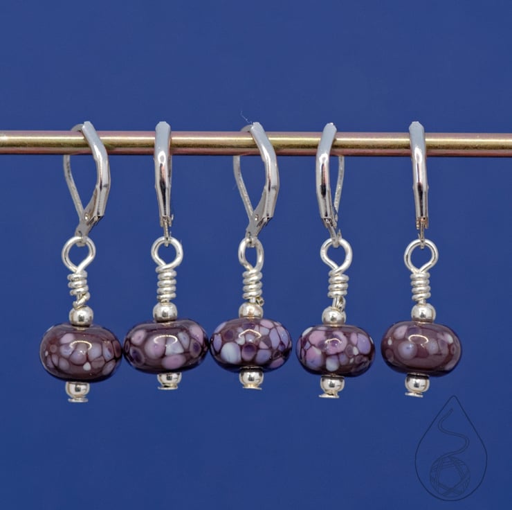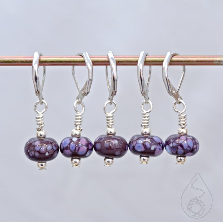 A set of 5 stitch markers made with lampwork glass beads in dark purple with delicate pink, lilac and blue details.