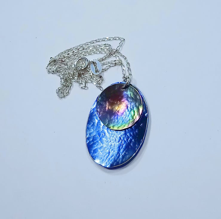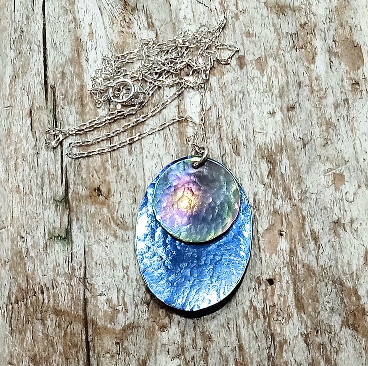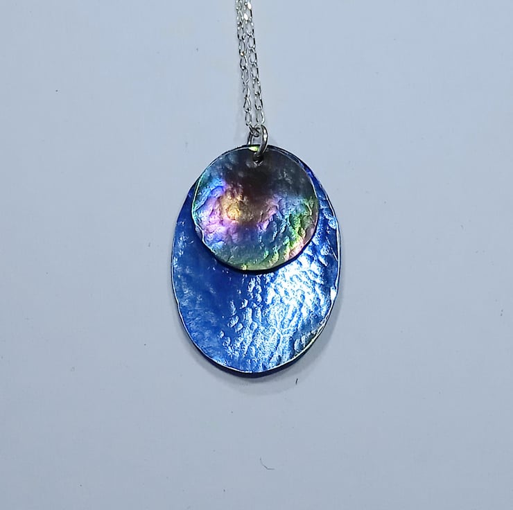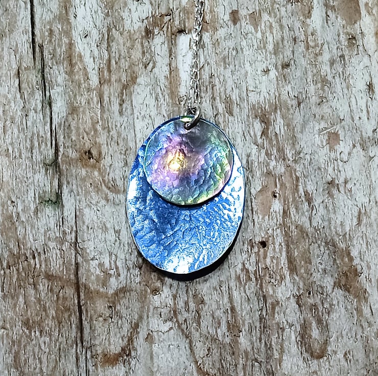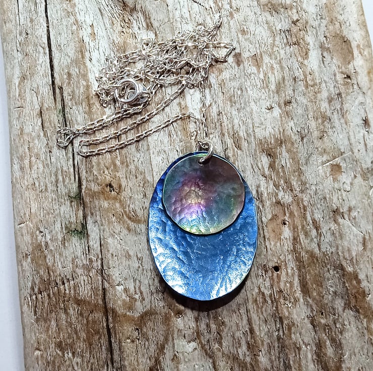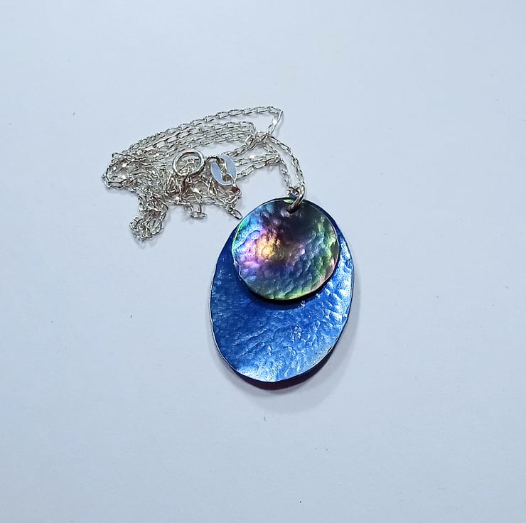I have hand sawed an oval and a disc shape from titanium sheet and given them a hammer textured finish and slight concave shaping before colouring. I have hung the disc over the oval to create a beautiful pendant.
