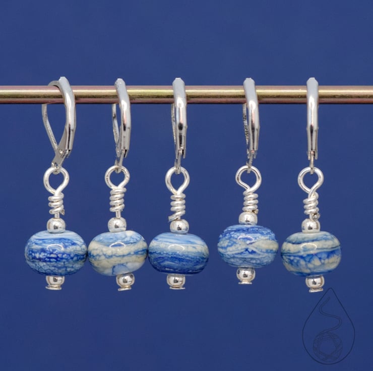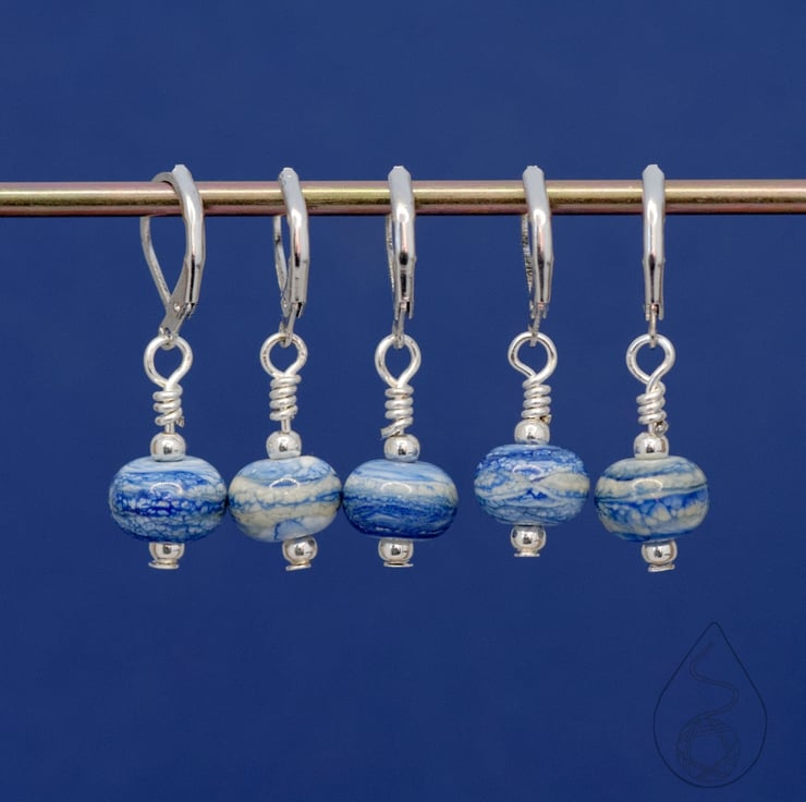 A set of 5 stitch markers made with lampwork glass beads with organic style blue swirls.