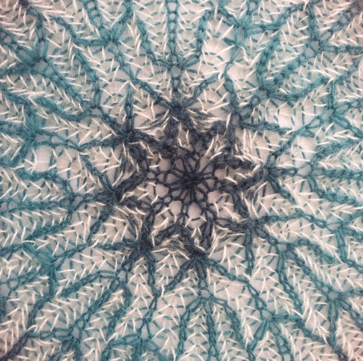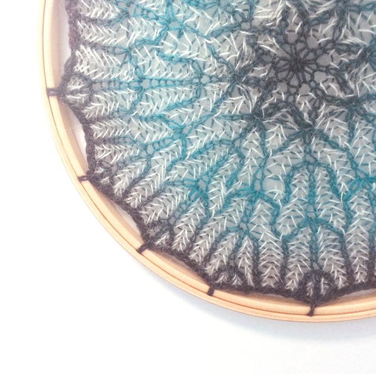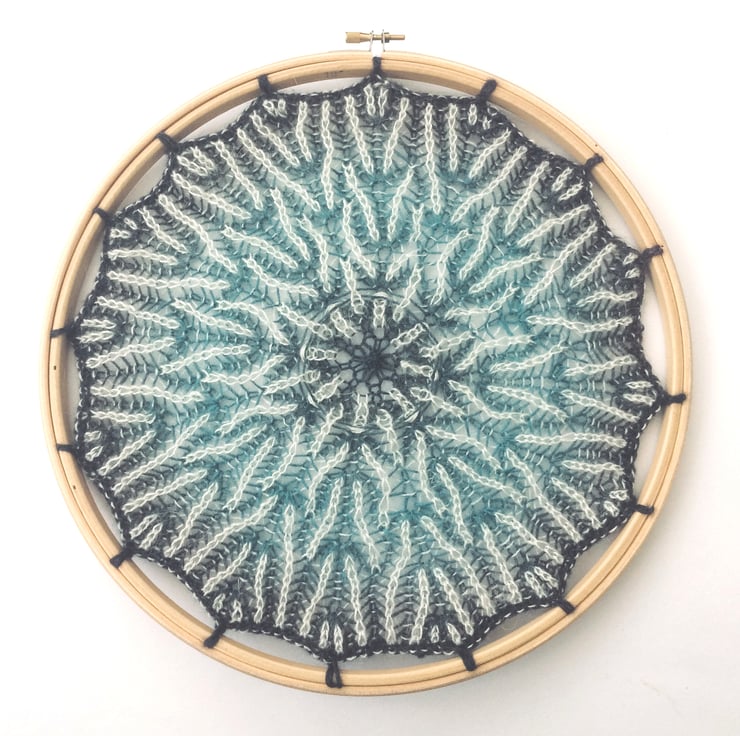 Brioche knitted 2 coloured mandala attached to an 12" embroidery hoop. Yarn used is a mix of blue/purple fine wool/silk yarn and white fine mohair.