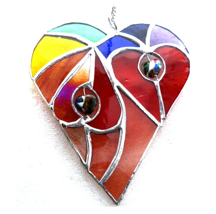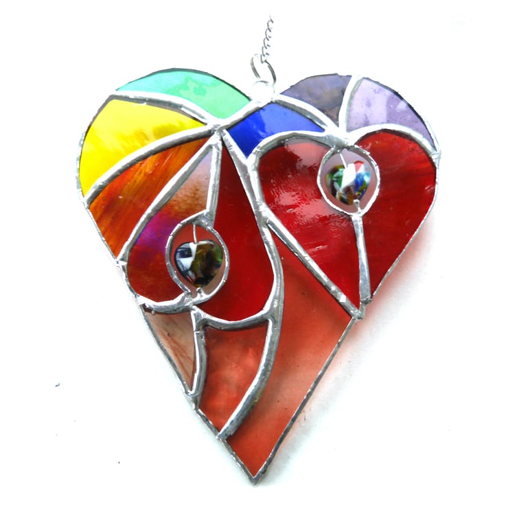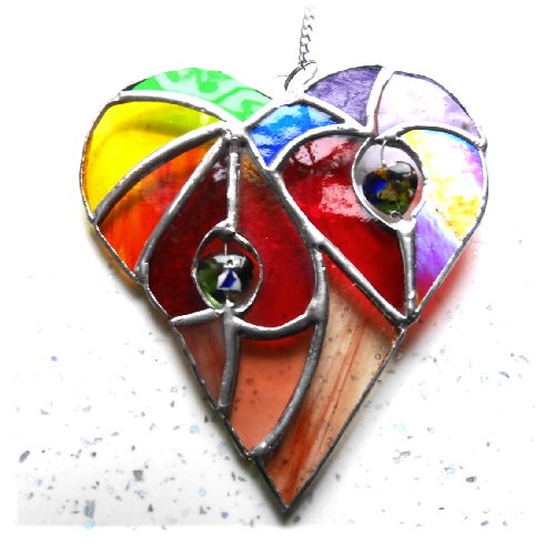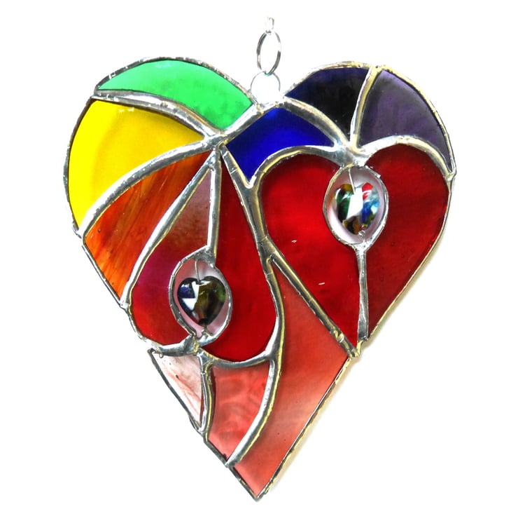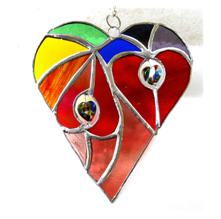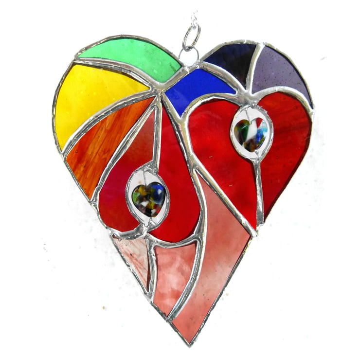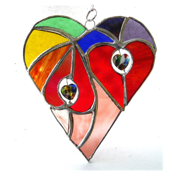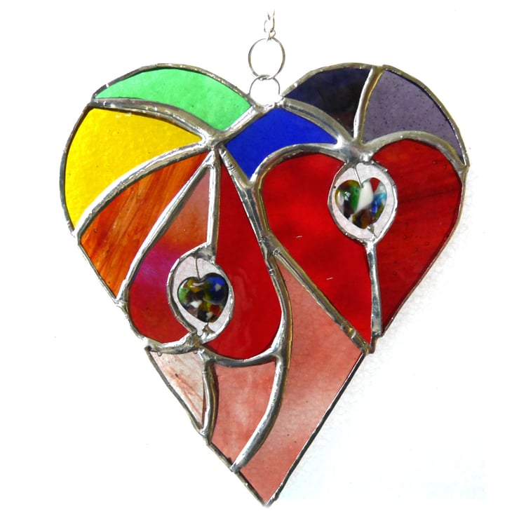 It is a big heart containing 2 smaller, bright red hearts which are surrounded by different shades of glass in all the colours of the rainbow.