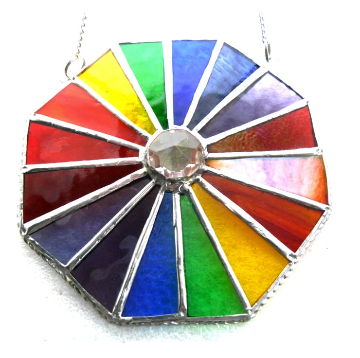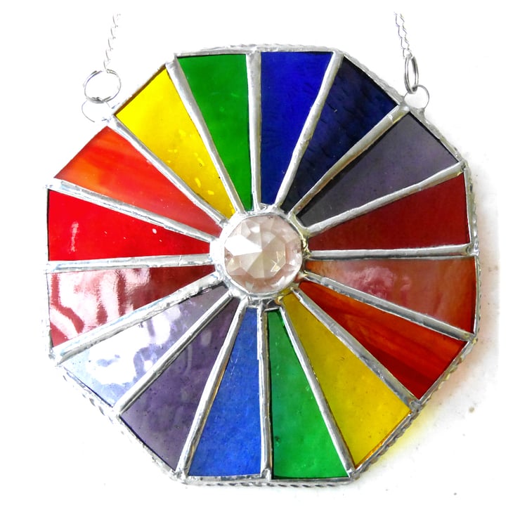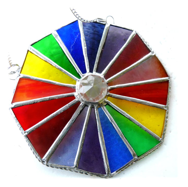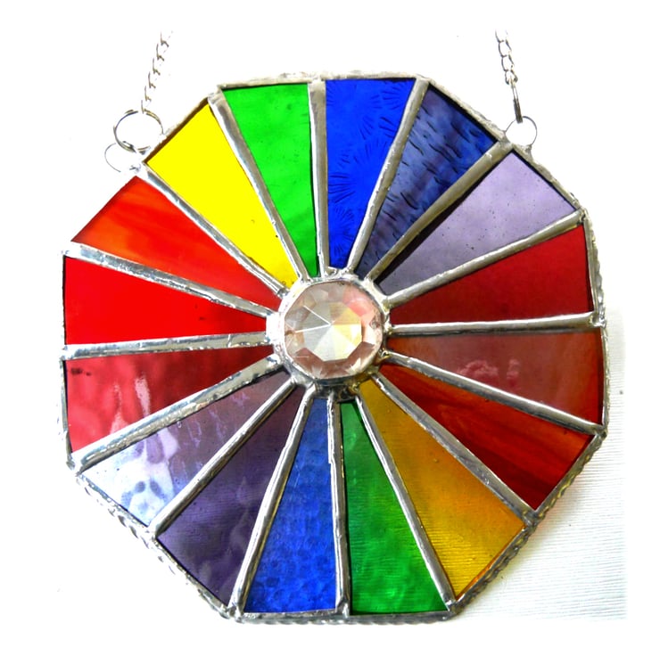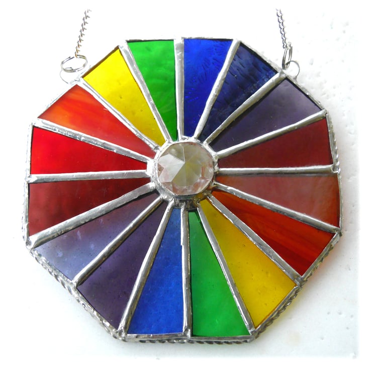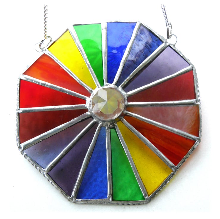 I love making pieces like this which use all the colours of the rainbow. I love the way they catch and throw the light. The crystal in the centre adds even more sparkle and makes it more special.