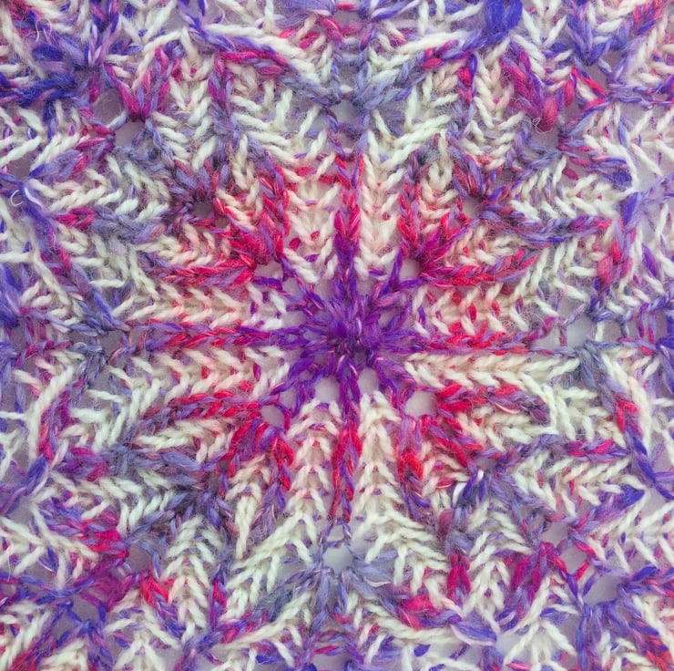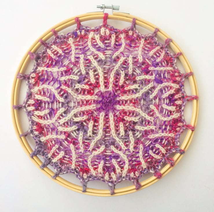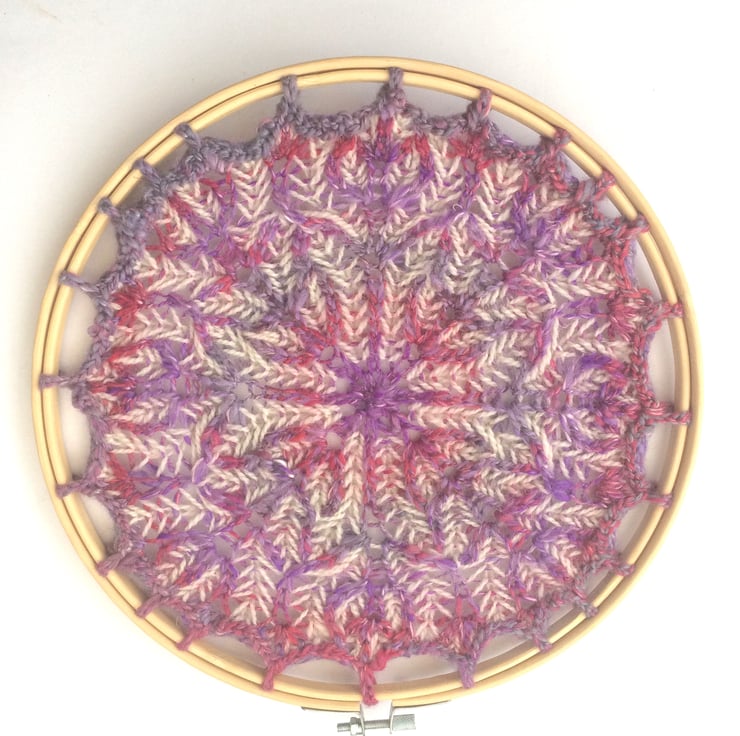 Brioche knitted 2 coloured mandala attached to an 10" embroidery hoop. Yarn used is a mix of hand dyed pink / purple wool/silk yarn and a while merino wool yarn.