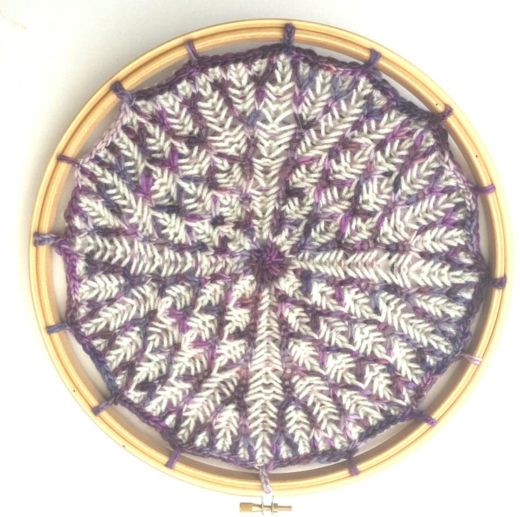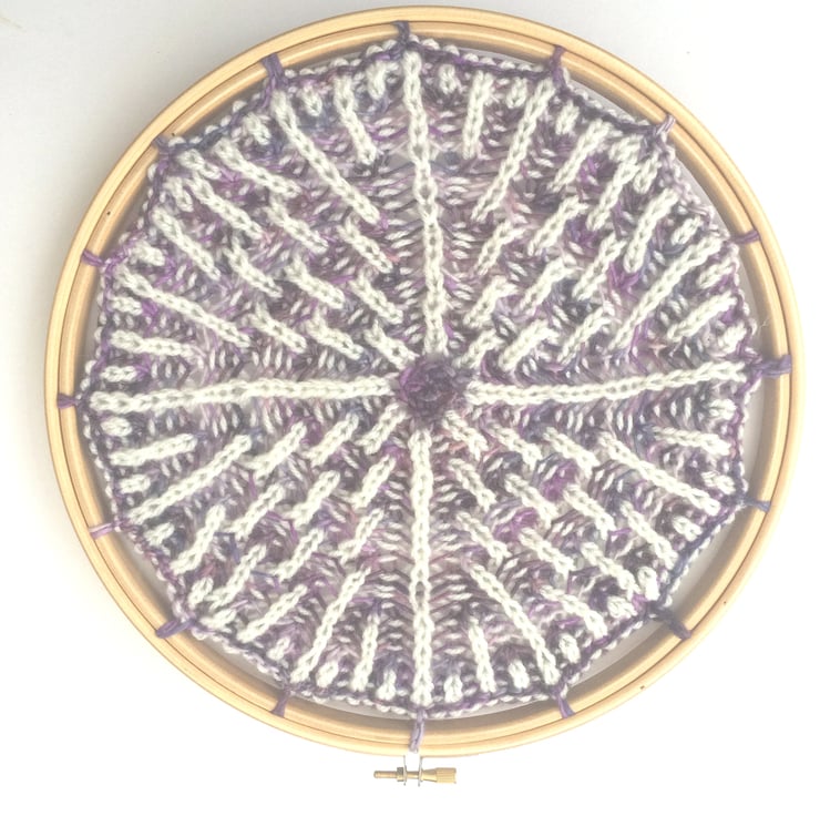 Brioche knitted 2 coloured mandala attached to an 10" embroidery hoop. Yarn used is a mix of kettle dyed pink/purple merino wool/silk yarn and white merino yarn.