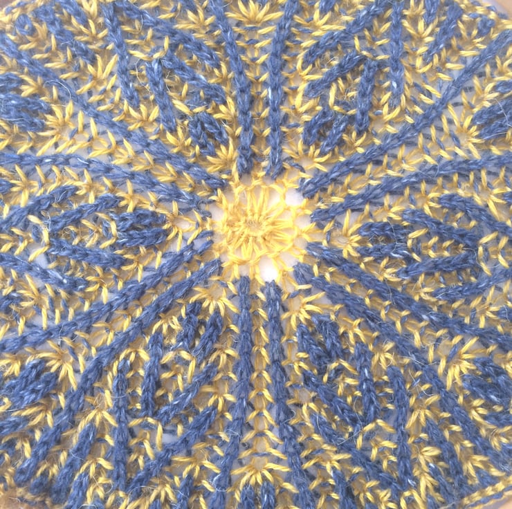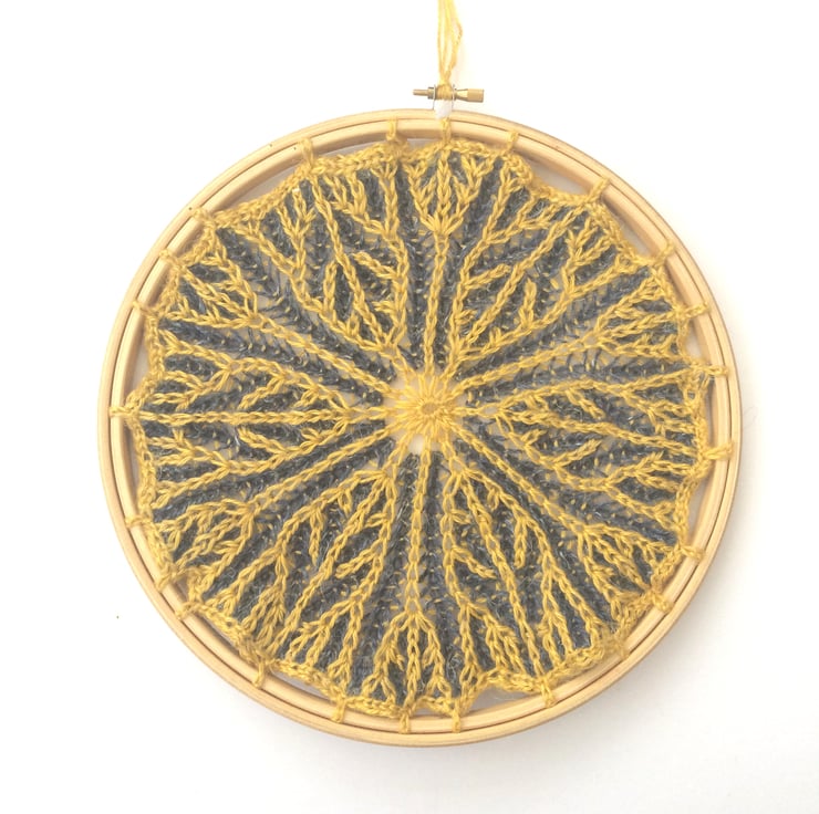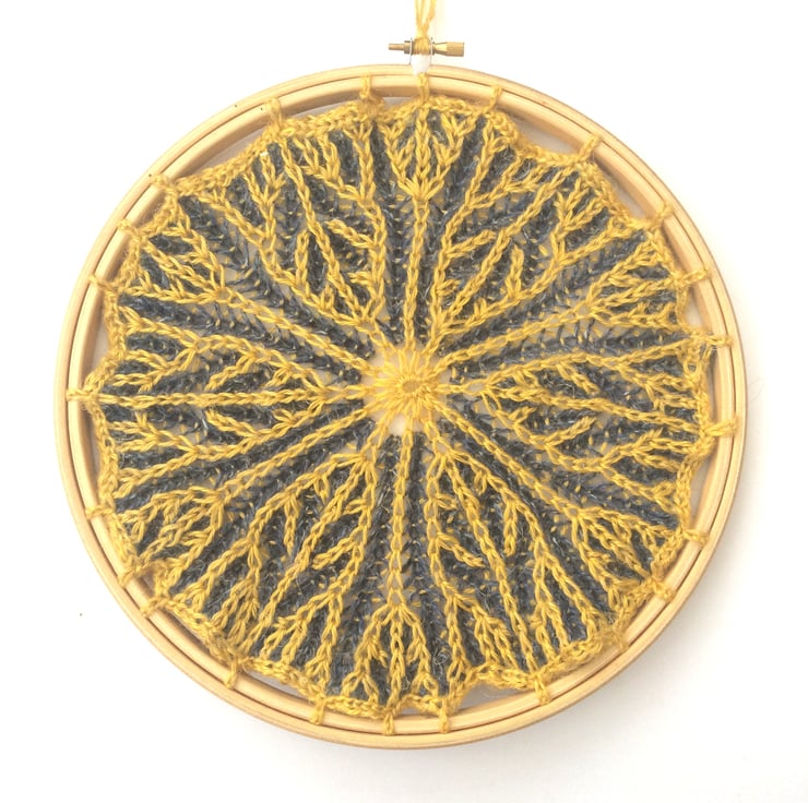 Brioche knitted 2 coloured mandala attached to an 10" embroidery hoop. Yarn used is a mix of golden yellow bamboo yarn and dark blue wool yarn.