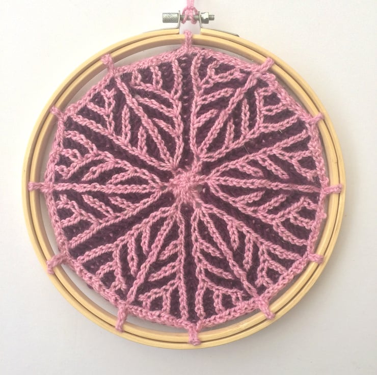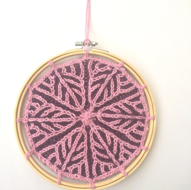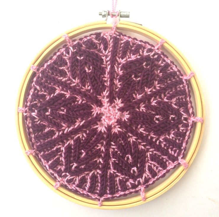 Brioche knitted 2 coloured mandala attached to an 7.5" embroidery hoop. Yarn used is a mix of fine pink (with a hint of sparkle) wool/silk yarn and dark maroon wool yarn.