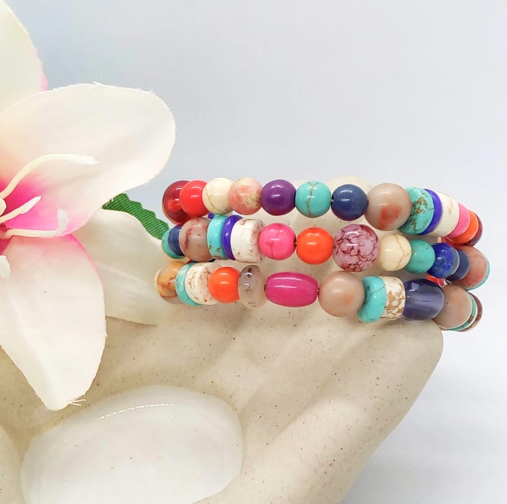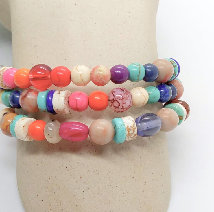 The cuff memory wire bracelet is made by threading pink, mauve, purple, blue orange white and red semi precious and glass pearl beads of varying sizes on to memory wire. It will comfortably fit a wrist 16 - 17 cm in circumference.