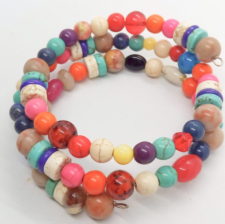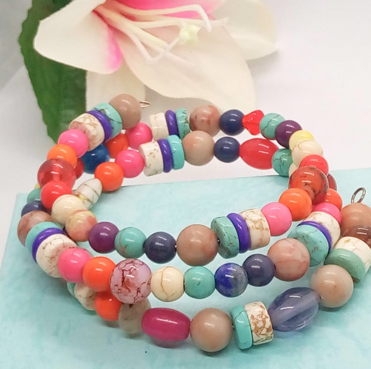 Memory Wire Cuff Bracelet made with Multi Coloured Glass and Semi Precious Beads, Boho Jewellery, Birthday Gift, Christmas In July, Gift for Her, Anniversary Gift