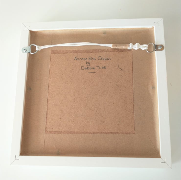 It’s not very often I get out my acrylic paints as watercolour is my main forte, but I do enjoy dabbling with other mediums here in my studio. “Across the Ocean” is an original acrylic abstract painting using soft blues and lilacs, then finished off with 2 birds flying across the ocean using silver ink. The colours compliment the fresh white frame.