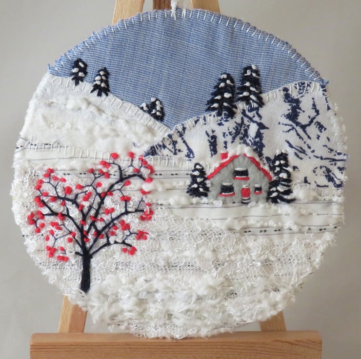 An atmospheric winter scene featuring a snowy hillside, snow-decked conifers, a berried tree and a tiny house all created from scraps of fabric and leftover yarn and lace.