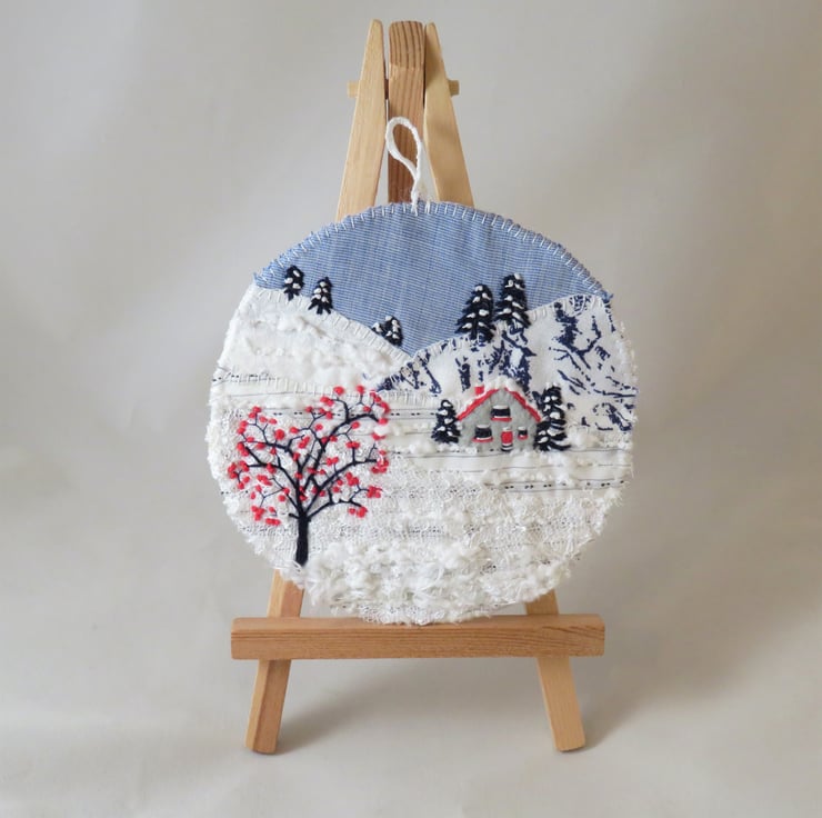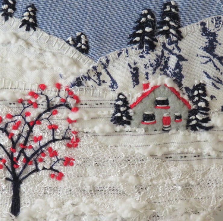 Scraps of fabrics in shades of white and blue, to represent snow and sky have been hand stitched onto a thick felt background. The fabrics are either recycled or are offcuts from previous work - my scrap bag is extensive! Details of the design have been added in simple hand embroidery using threads (some of which are vintage) and two textured yarns - one of them leftover from a project and gifted to me by a crafty friend.