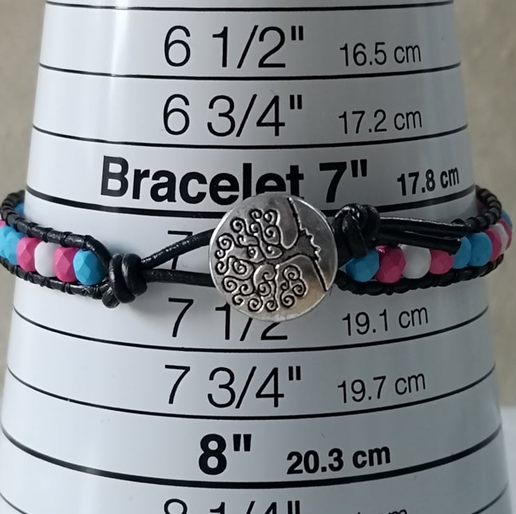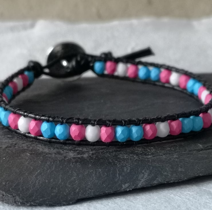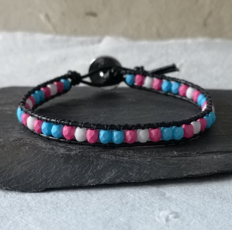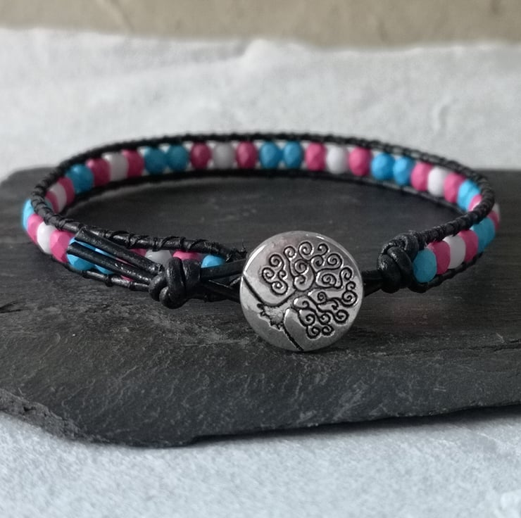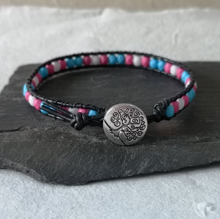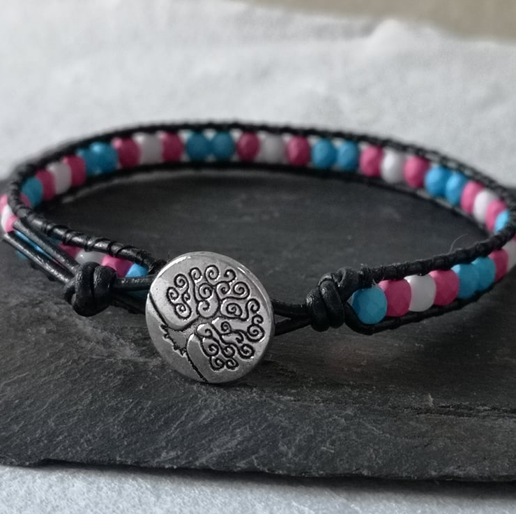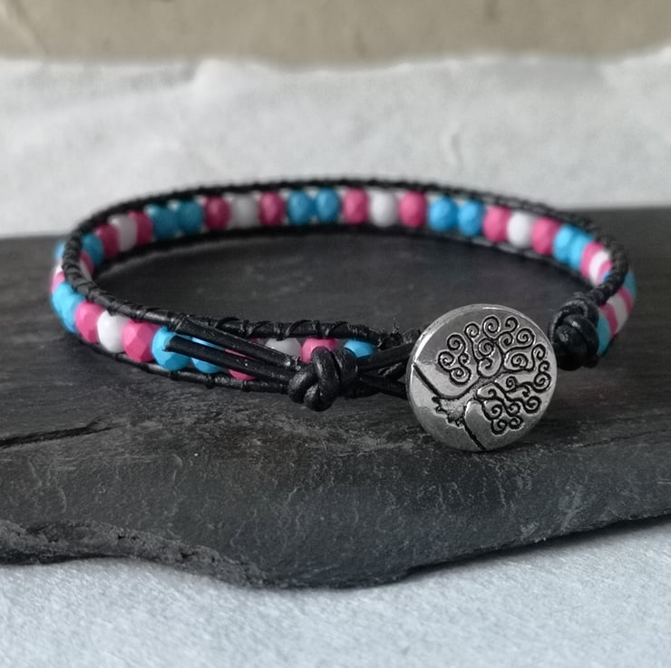 This simple bracelet has been made with small Czech glass beads in the blue, pink and white colours of the trans flag. They've been attached to black leather cord and a silver coloured button with a tree of life decoration has been used as a fastener.