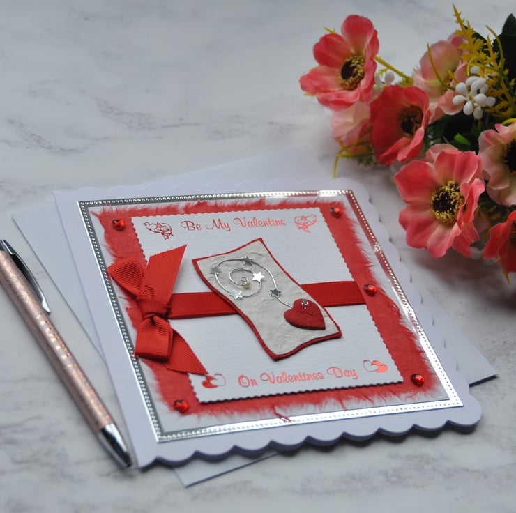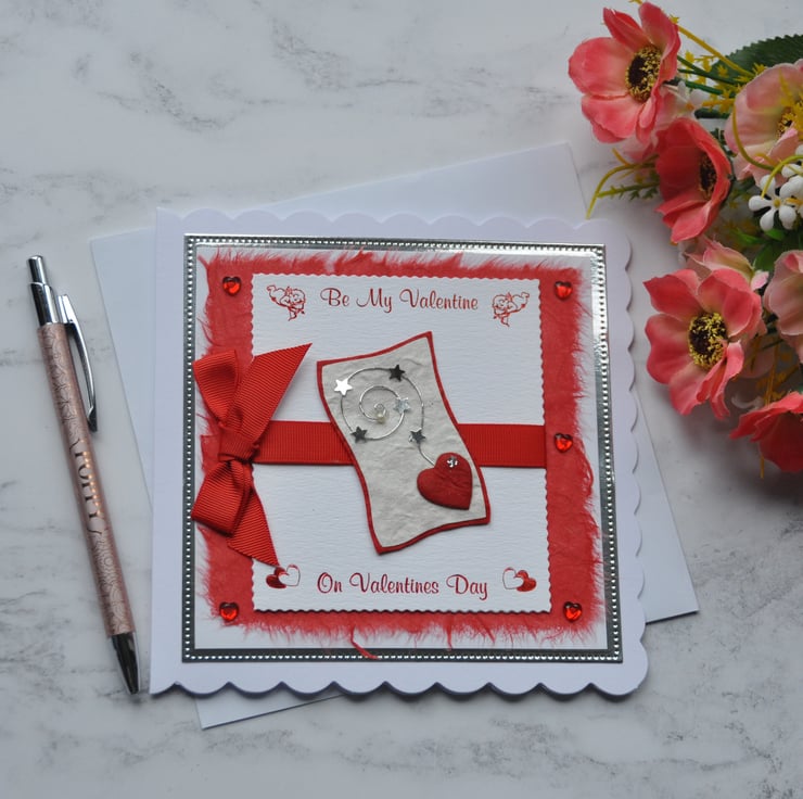 This mixed media design is a vintage style handmade love heart suspended on silver wire with stars. The sentiment greeting is red foiled and says Be My Valentine On Valentines Day, with my own red handmade paper in the background. The card is finished with red ribbon, silver foil, a touch of glitter, and gems.