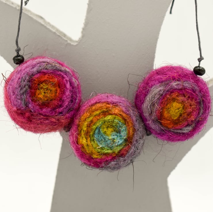 This statement necklace has been created using three felted beads made from multicoloured 100% North Ronaldsay wool rovings, small wooden spacer beads and strung on dark grey 0.5mm hemp cord. Each bead is unique and can contain pink, purple, yellow, turquoise and green.
