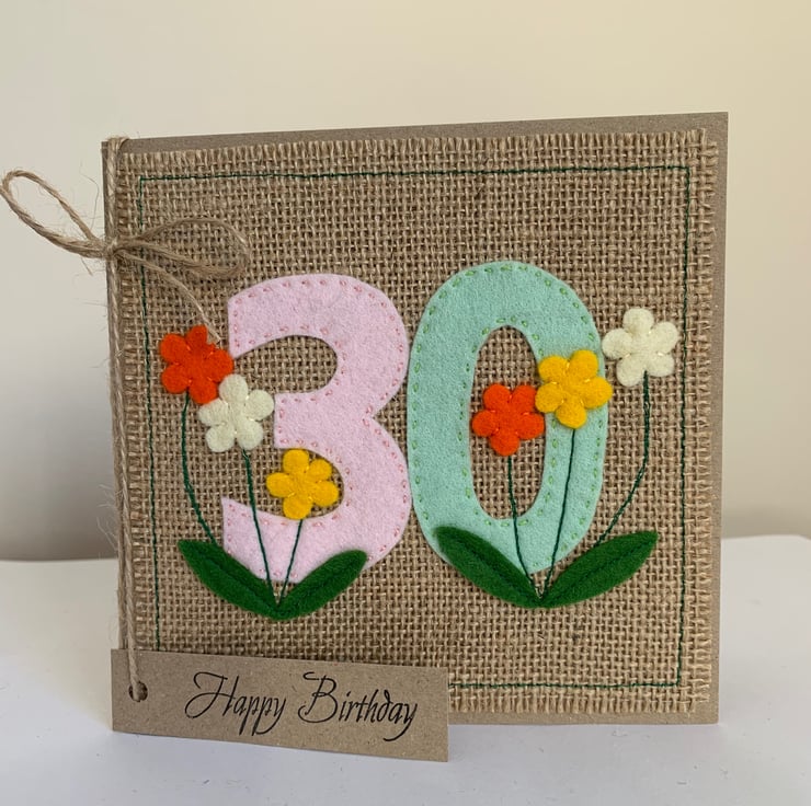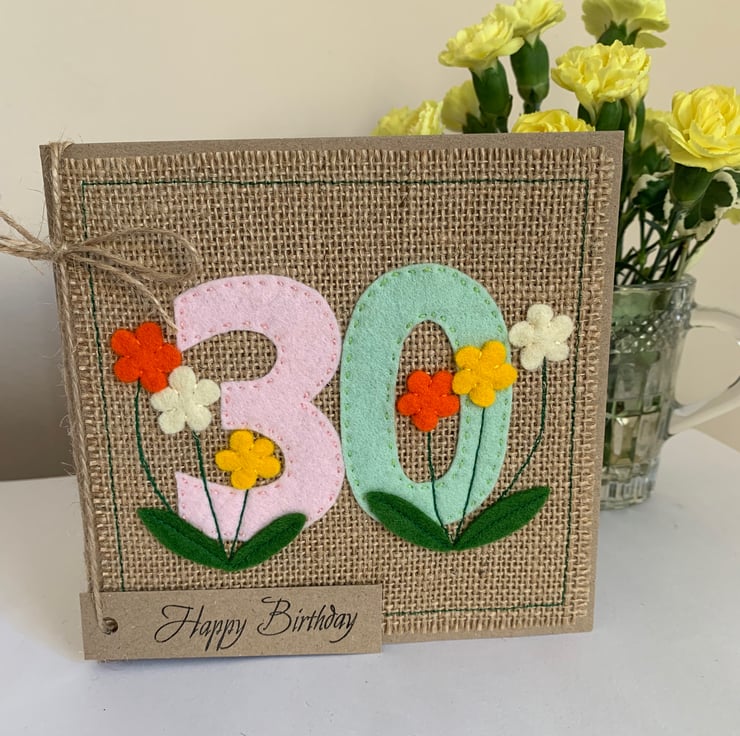 A card for a special birthday. The numbers are hand cut from pale pink and mint green acrylic felt and hand sewn to a hessian background. Flowers from wool felt are added to decorate the card.