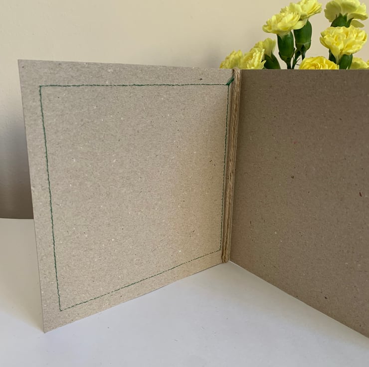 The hessian is machine stitched, using a contrasting thread, onto a plain brown recycled card. This stitching is visible on the inside of the card.
