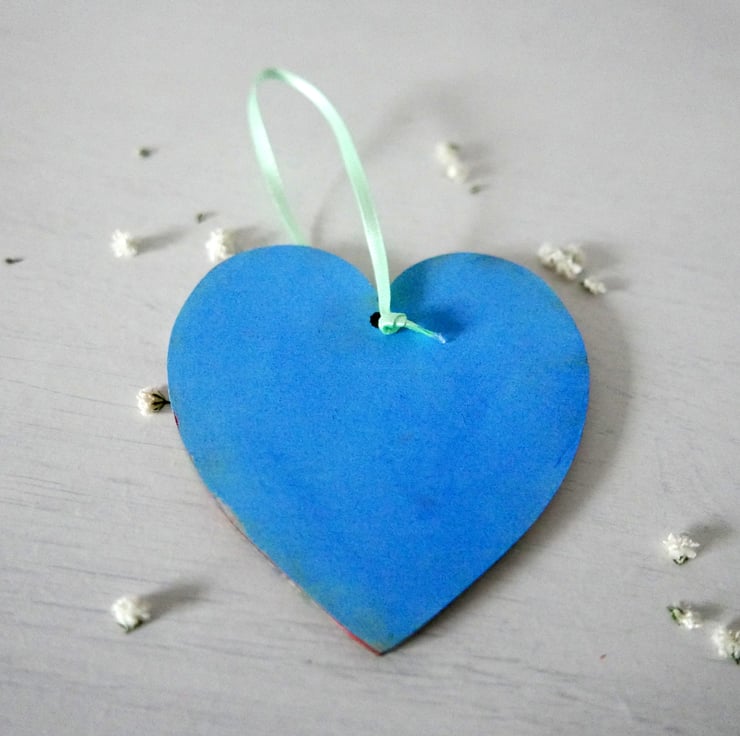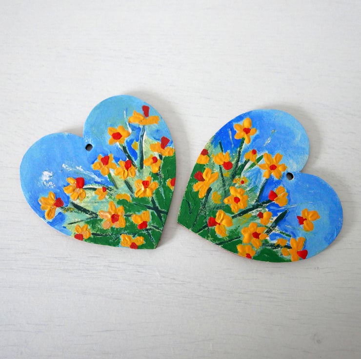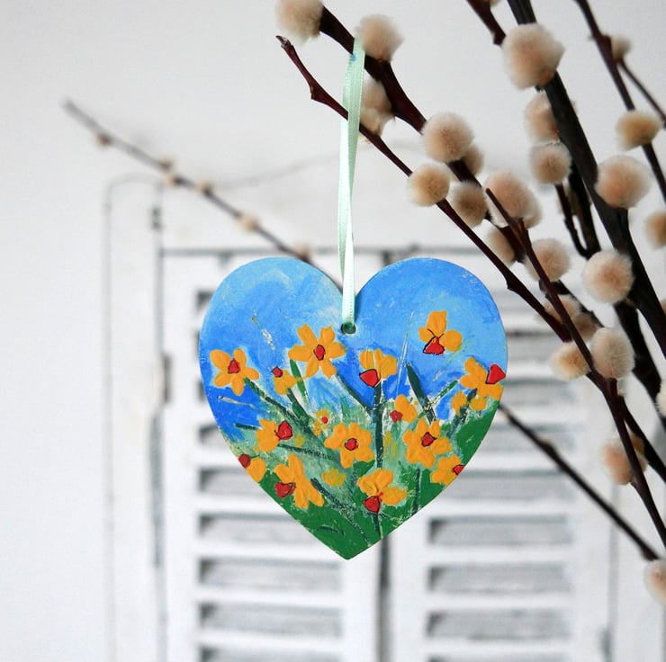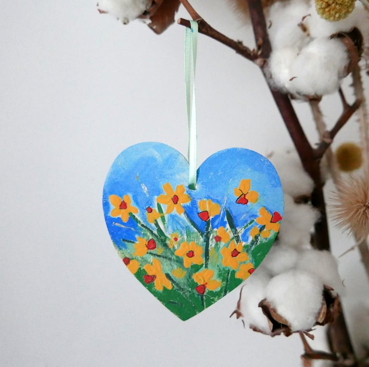 This floral daffodils hanging heart is perfect for a touch of spring in your home all year round. It can be offered as Valentine's Day gift, a gift for Mother's Day or it can be hung in your Easter tree. It is hand-painted by me in acrylic paint and it looks like a mini painting. It measures approx 3" x 3" (7.5 cm x 7.5 cm) and it is painted at the back in light blue. It has an elegant pale green ribbon for hanging.
