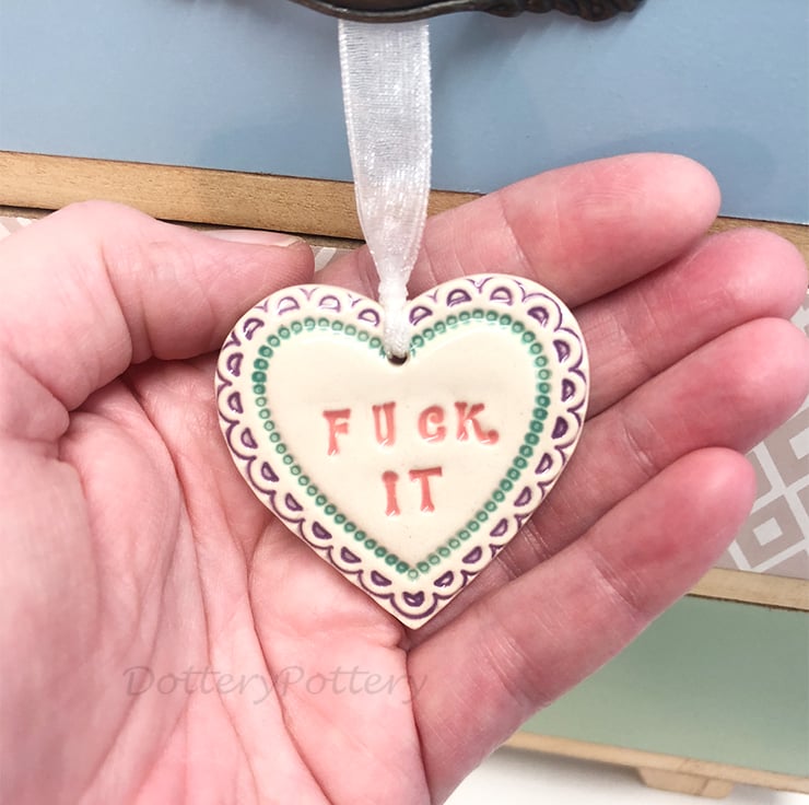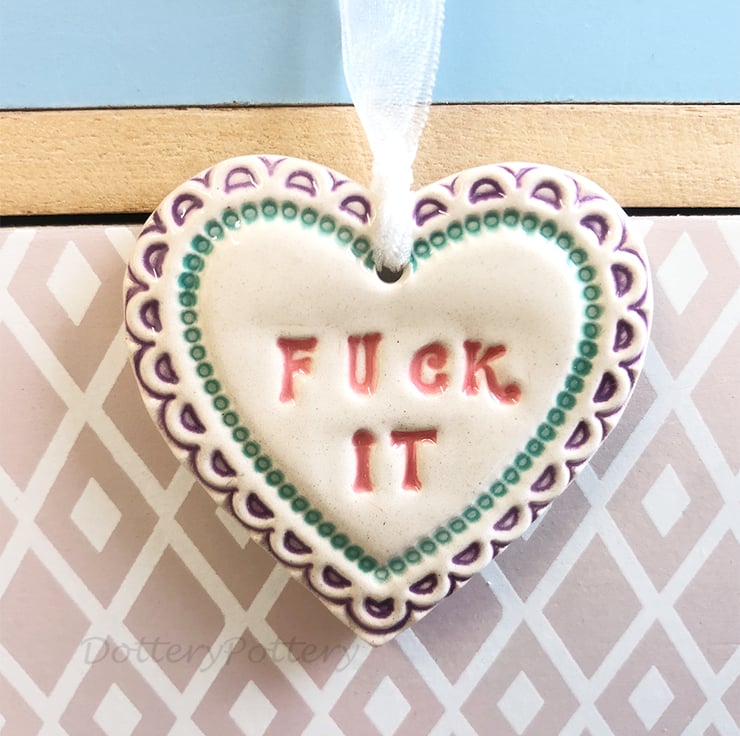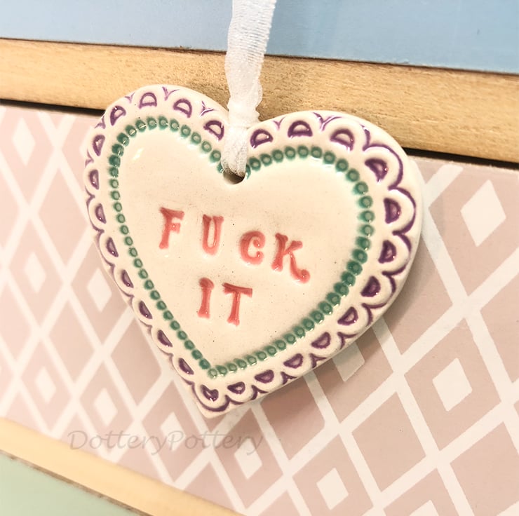 This little heart is made from white earthenware clay, imprinted with the words FUCK IT. The perfect gift to let someone know how much you love them! Some of the letters may be a bit higgledy piggledy but they have been stamped with love! It has been fired twice, once to the bisque stage and then a second firing for the clear glaze. It measures 4.5 centimetres wide x 5cm height x 5mm thick. It can be hung outside.