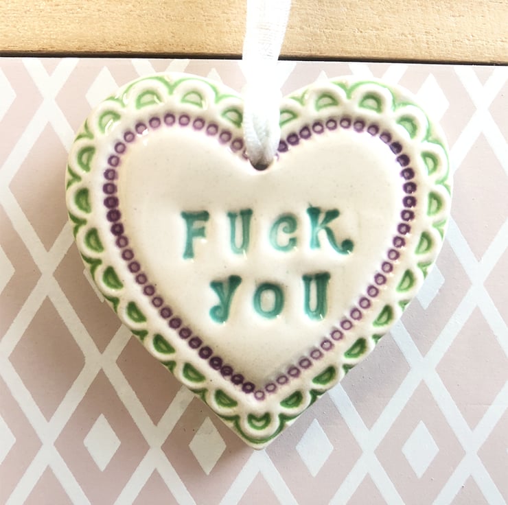 This little heart is made from white earthenware clay, imprinted with the words FUCK YOU. The perfect gift to let someone know how much you love them! Some of the letters may be a bit higgledy piggledy but they have been stamped with love! It has been fired twice, once to the bisque stage and then a second firing for the clear glaze. It measures 4.5 centimetres wide x 5cm height x 5mm thick. It can be hung outside.