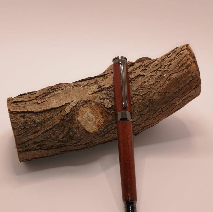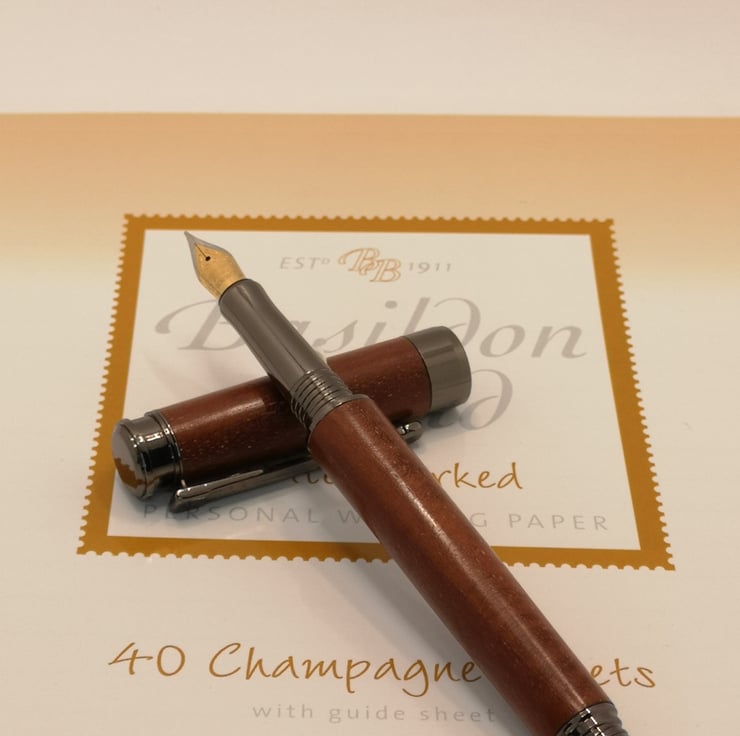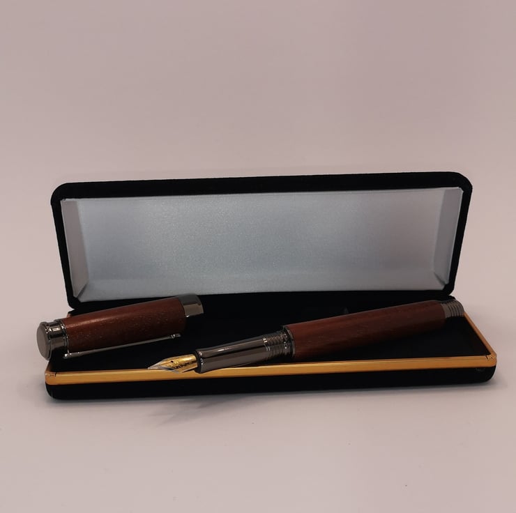 A deluxe fountain pen in mahogany with gunmetal finials and nib housing. Turned, sanded and burnished to bring out a richer colour, the mahogany was sealed and finished with melamine lacquer for a hardwearing and durable finish. The nib is a medium IPG nib and writes very smoothly. I use a similar pen for work which has a nice feel and balance. You can post the cap on the finial if you choose when writing. The pen is supplied in the velvet pen box shown in the pictures and also comes with two international style ink cartridges (not Parker) and an ink converter if you prefer to use bottled ink.