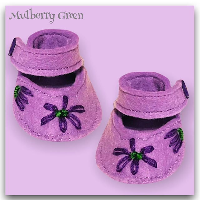 A cute little pair of embroidered lavender shoes. They are hand sewn in felt especially to fit the Mulberry Green dolls. They fasten with a little popper underneath a button.