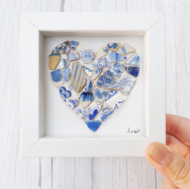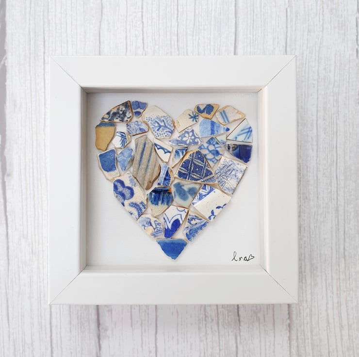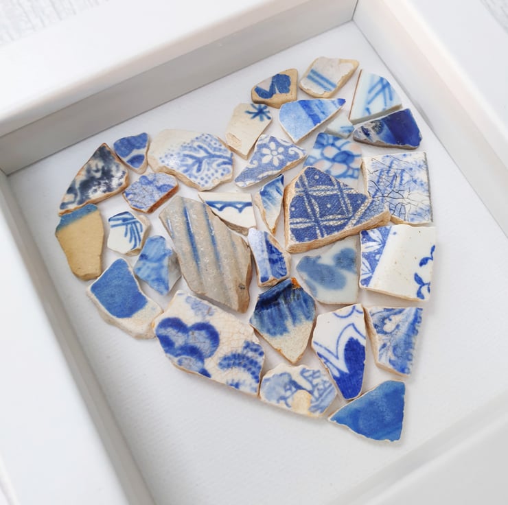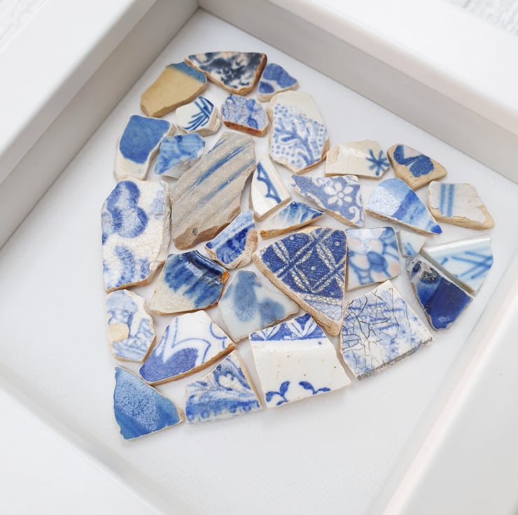 Show someone you love them with this beautiful eye catching framed heart created with several vintage blue pottery personally found on the foreshores of London River Thames.