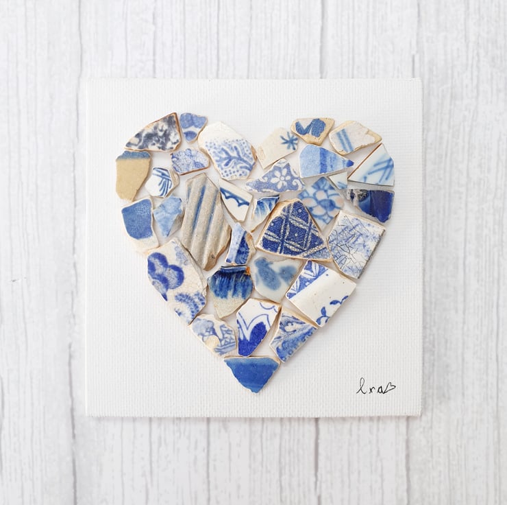 This heart was created with many pieces of vintage blue river pottery on canvas. The white frame measures approximately 11.5cm x 11.5cm. The frame will come with glass although photos were taken without one to avoid reflections.