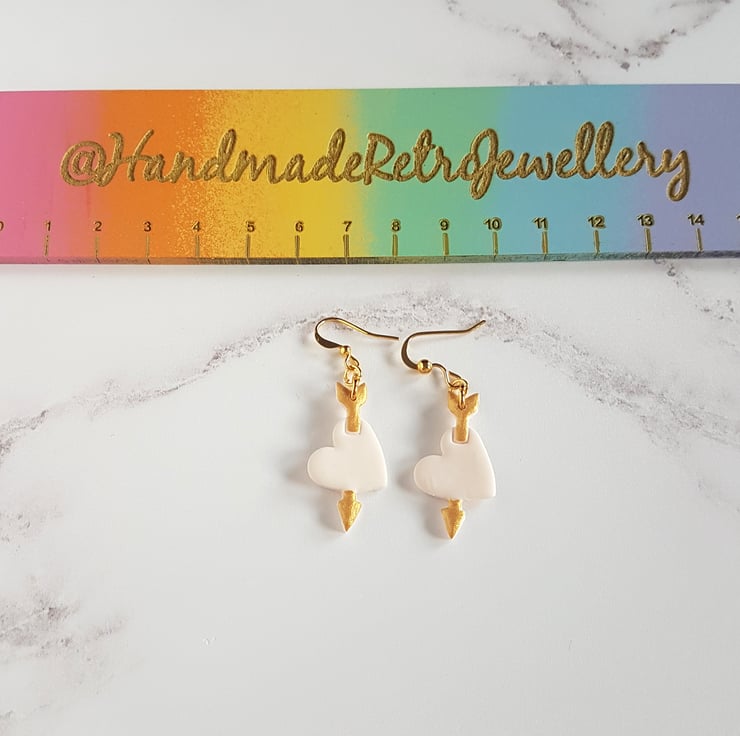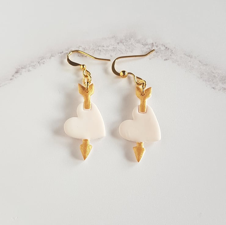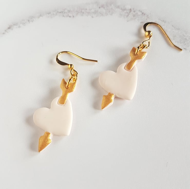 These cute heart and arrow earrings have been carefully hand made using white polymer clay with the arrow hand painted using gold acrylic paint.