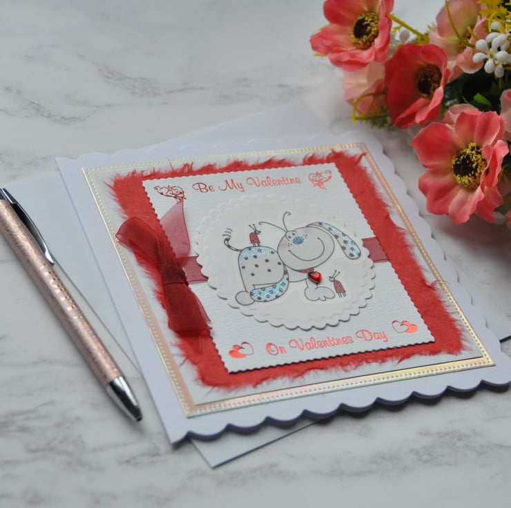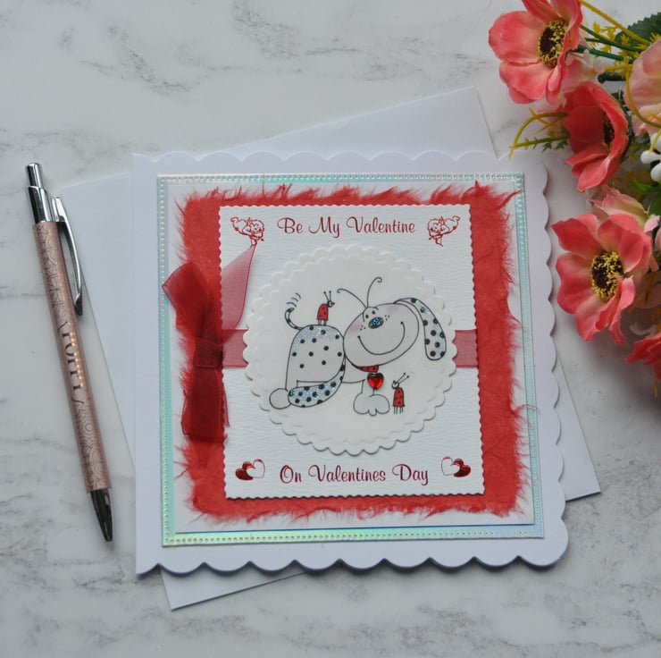 This design is a cute puppy dog wagging his tail because he is so happy that you are in his life. He is wearing a love heart on his dog collar around his neck and a huge smile on his face. The sentiment greeting is red foiled and says Be My Valentine On Valentines Day, with my own red handmade paper in the background. The card is finished with red ribbon, foil, and a touch of glitter.