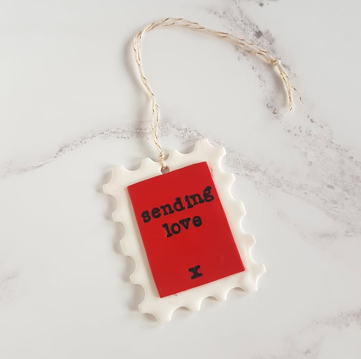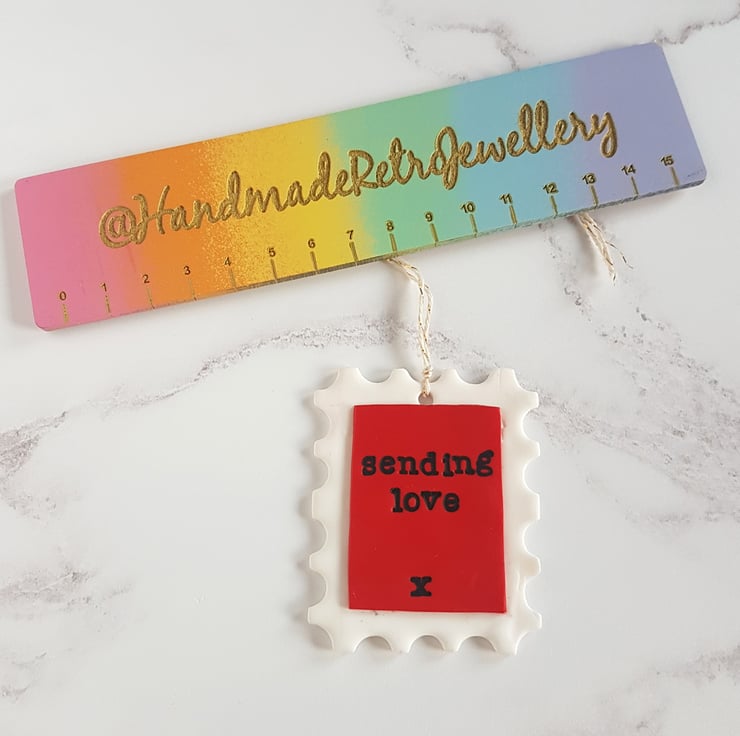 A fun and bright postage stamp shaped decoration, made from polymer clay, with the phrase 'Sending Love' and a kiss hand stamped into the clay, painted in black acrylic paint for added definition. Such a fun piece to send to someone special!