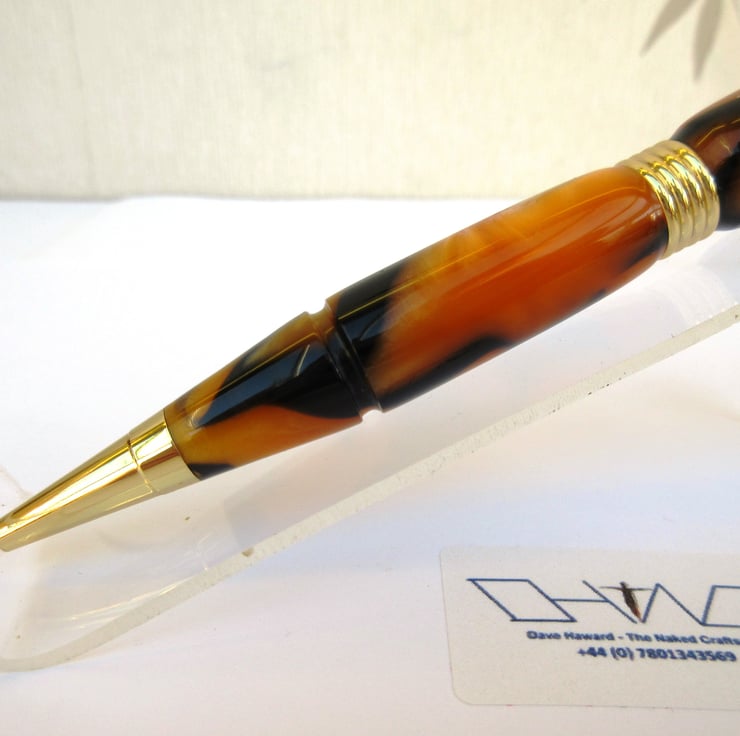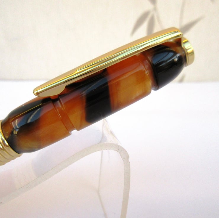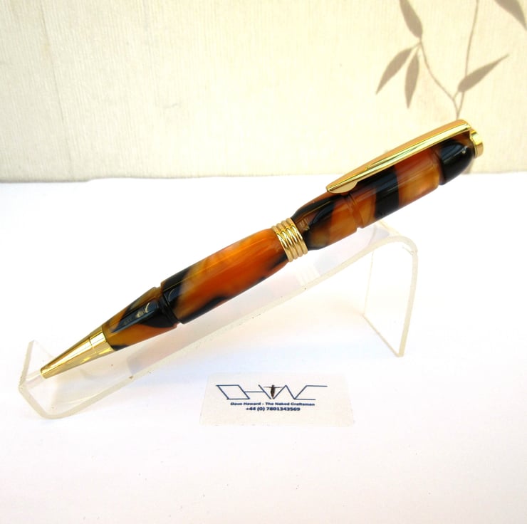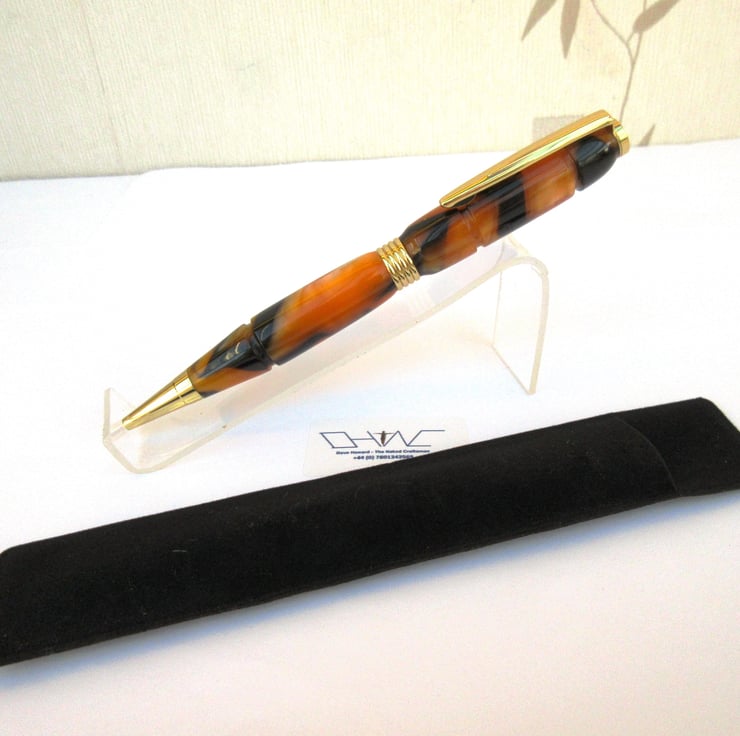 For sale here is a beautiful hand crafted Ballpoint Roller Ball Pen personally turned by myself from a rich, shimmering, translucent colour acrylic. In this case predominantly Orange and Black Tiger Pattern.