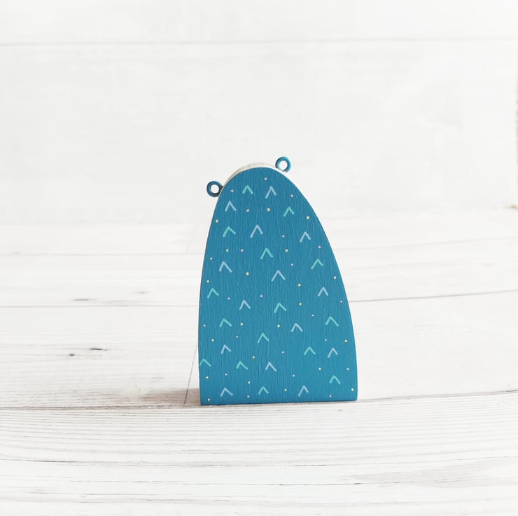 This sleepy little wooden bear has been cut from 12mm plywood, painted teal and decorated with turquoise, blue, yellow and pink on both sides.