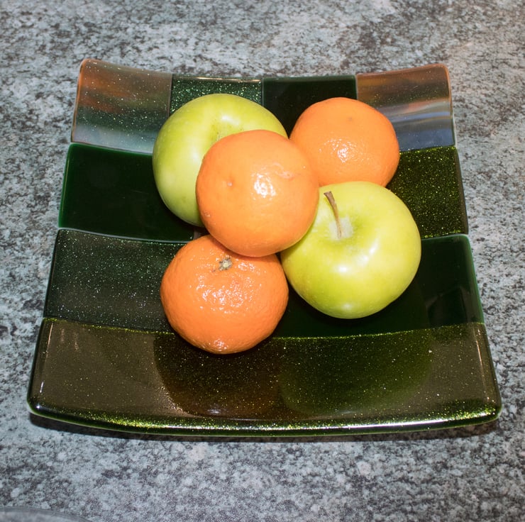 The platter is made from 11 pieces of glass - The base is clear, with hand-cut sections of different green glass laid out in a pattern that's proven to be popular..The whole piece is baked at around 800 C in the kiln. The kiln controls the heating and cooling, ensuring that all stresses are removed from the glass, making it safe and strong for you.