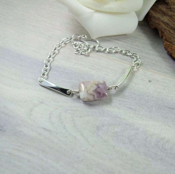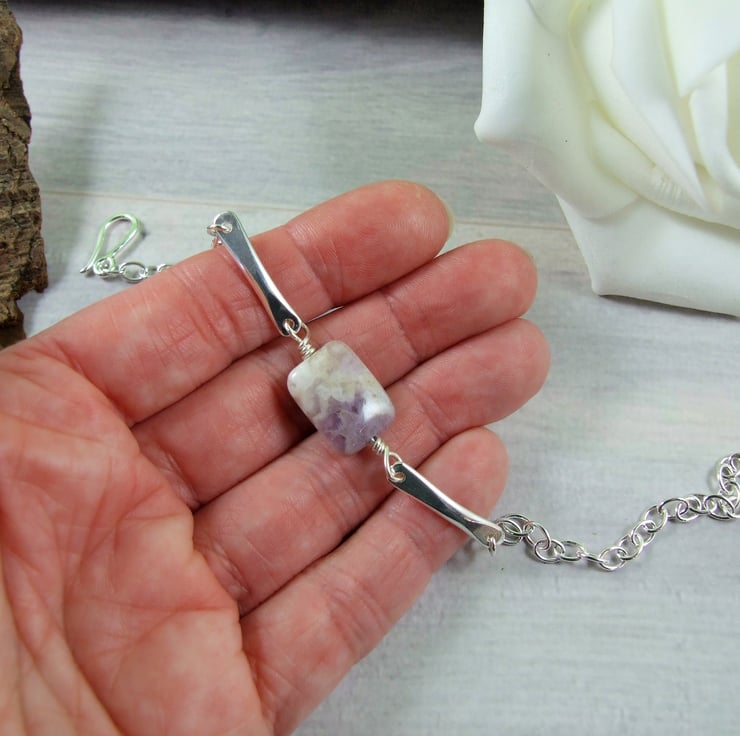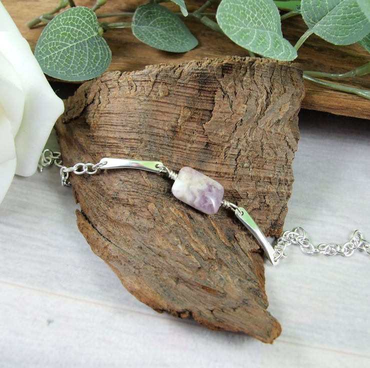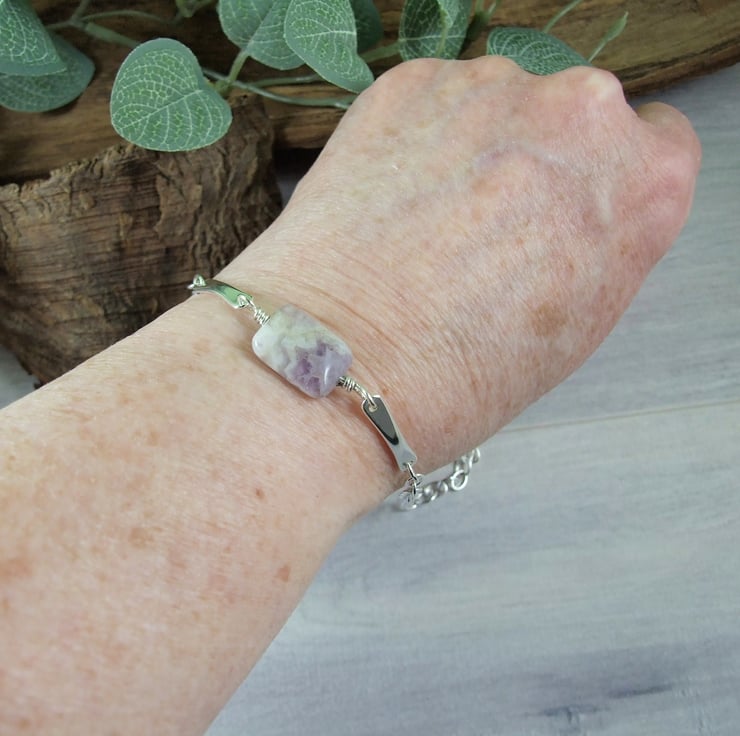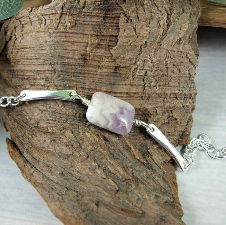 Handcrafted bracelet, the centre stone is a pretty amethyst gemstone bead wire wrapped and fitted to two small silver bars. I have created the bars from 3mm wide oval wire hammered at each end and rounded smooth with holes drilled and fitted to sterling silver chain with hook style clasp closure.