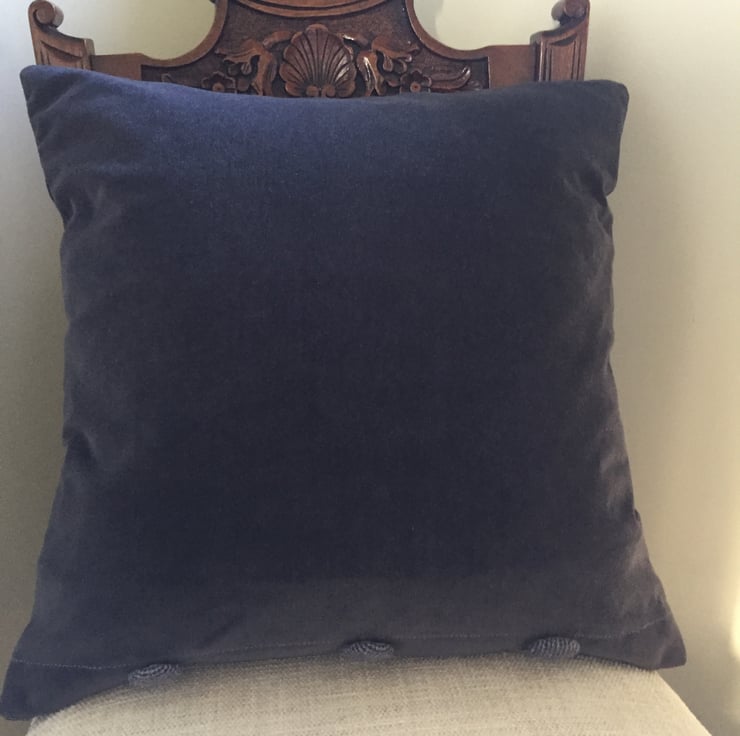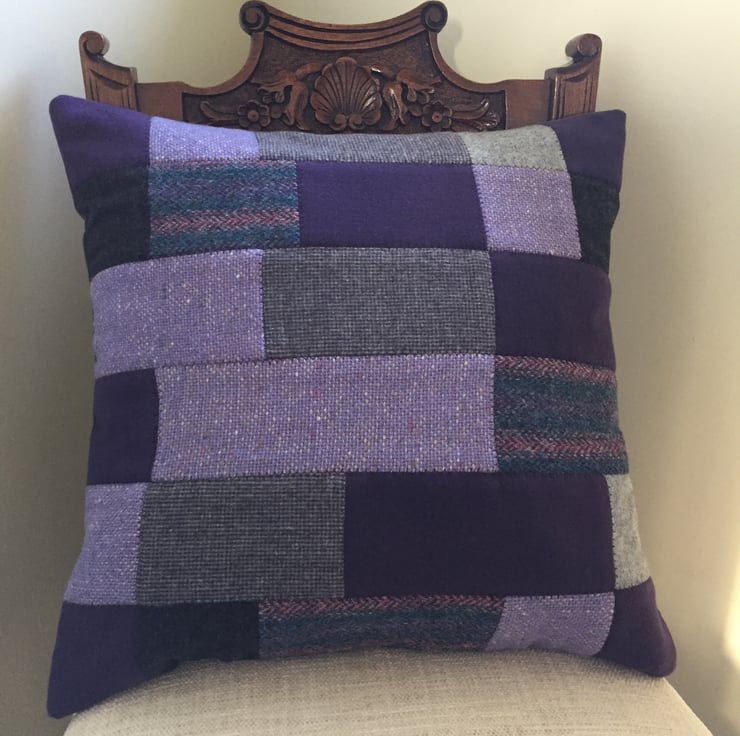 An 18”(46cm) square cushion using a patchwork of rectangles/squares of various sizes in tweed and wool fabrics. Several patches are Harris tweed and Donegal tweed. Main colours are purple, lilac, light grey, dark grey. Each patch has been outlined with a chevron machine embroidery stitch in purple. A facing has been attached at the bottom of the cushion to allow for three button loops to be inserted. Three corresponding matching covered buttons have been attached to the backing which has been made from a mid-grey velvet fabric.