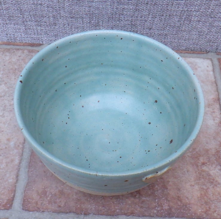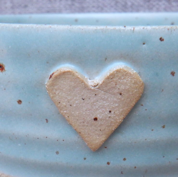 I threw this bowl on my pottery wheel using strong off-white stoneware clay, with a distinct speckle, added a little heart stamp, and finished it in a pretty light green celadon glaze.