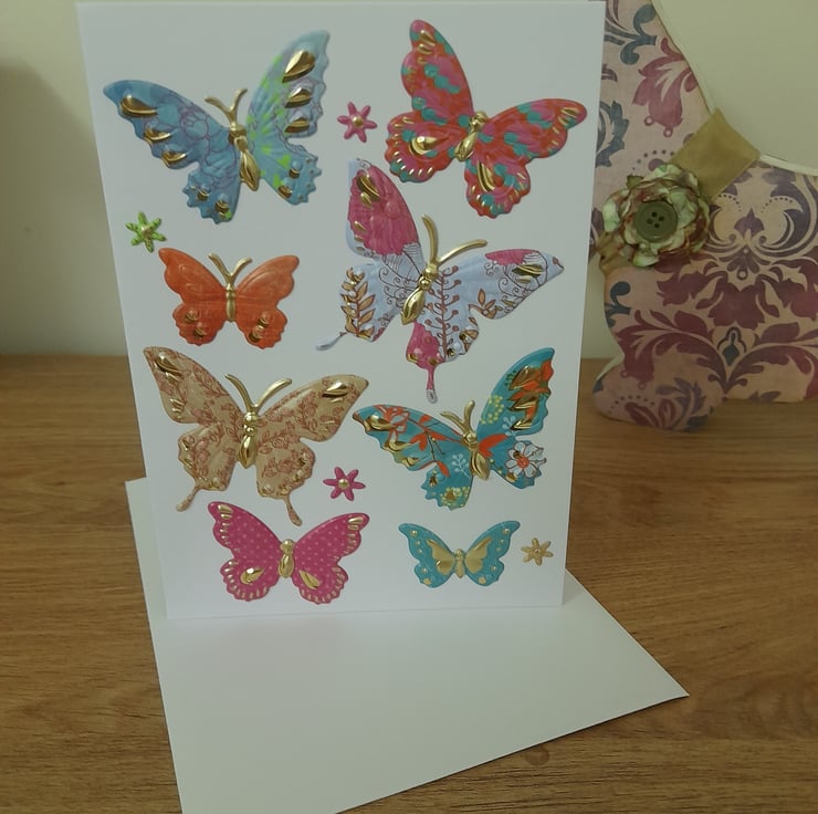 HANDMADE BUTTERFLY GREETINGS CARD MADE USING GOOD QUALITY WHITE CARD ALONG WITH SMALL, MEDIUM AND LARGE MULTI COLORED EMBOSSED BUTTERFLIES AND LITTLE FLOWERS.
