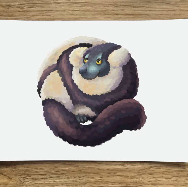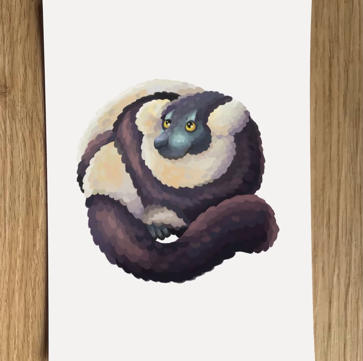 A lovely A6 Black and White Ruffed Lemur by DuffleCat Prints (Damian Case) post card. Back of card is blank for your message. 105 x 148 mm. 330gsm card stock.
