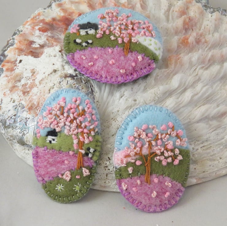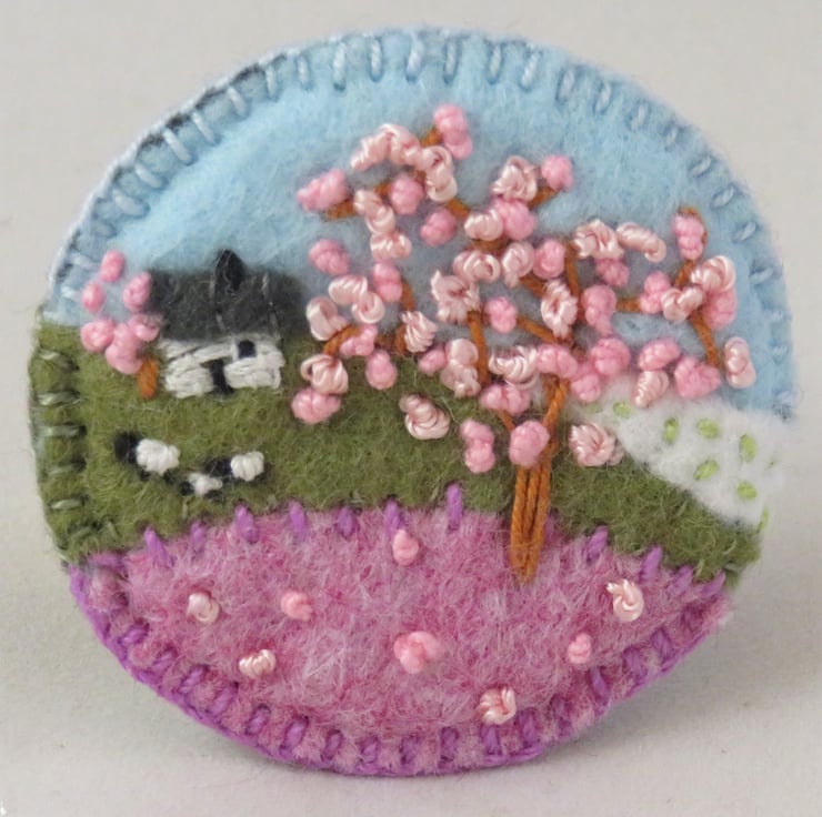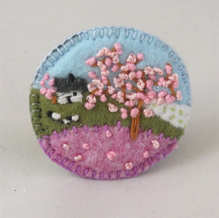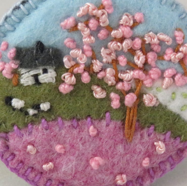 The background of the brooch has been created from felt. The tree has been stitched in cotton threads using simple embroidery stitches. The blossom has been stitched in two shades of pink thread - one of which is a vintage thread with a lovely sheen.