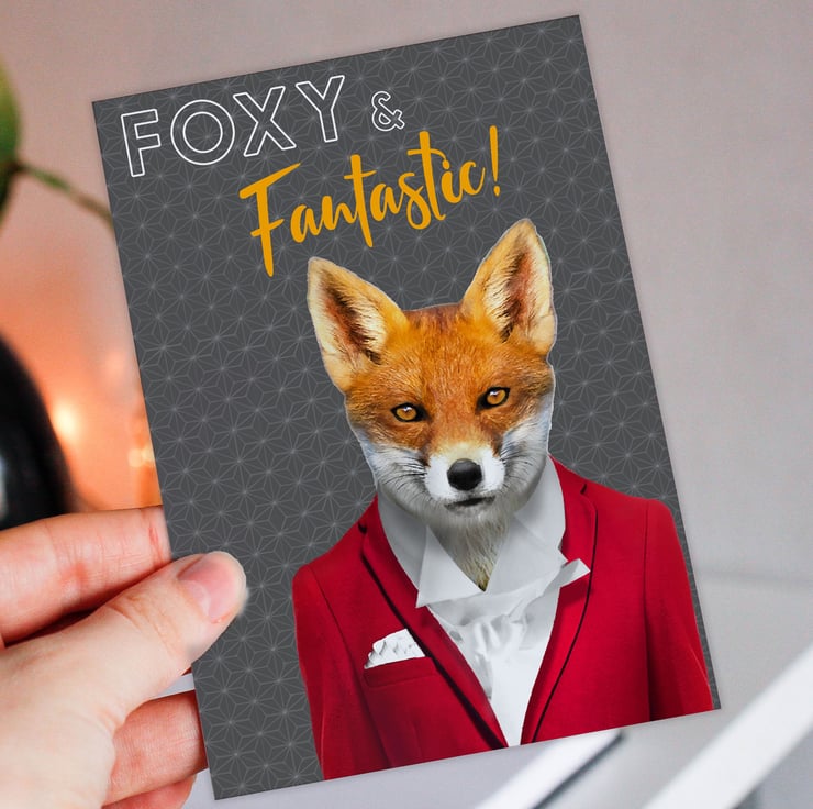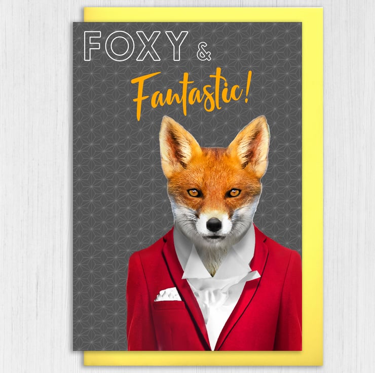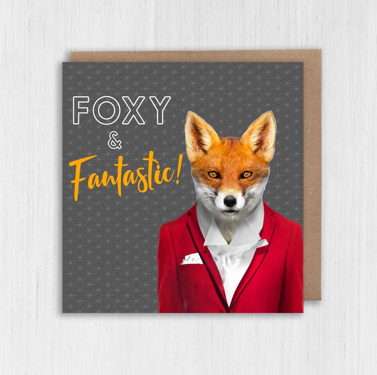 Fox in clothes anniversary card for wife, husband, partner: Foxy and fantastic (Animalyser) (Size A6/A5/A4/Square 6x6")
