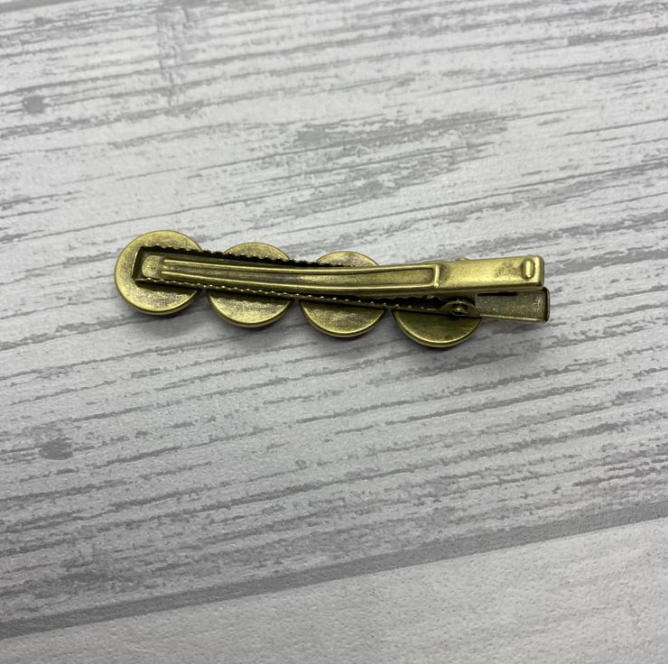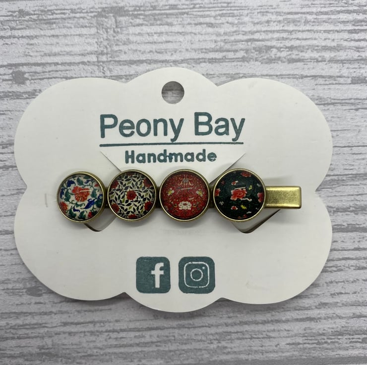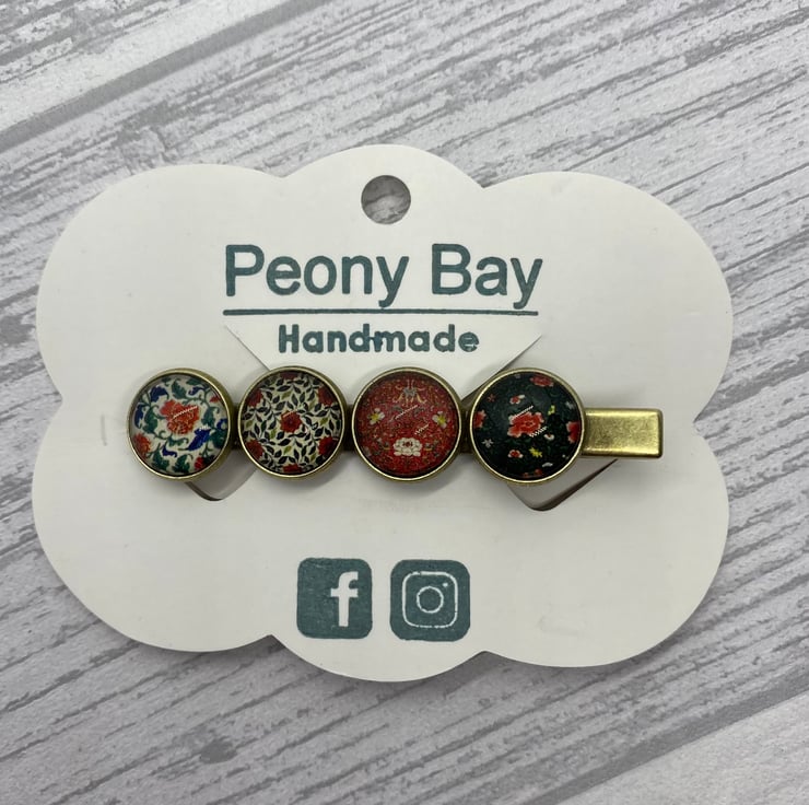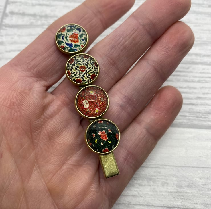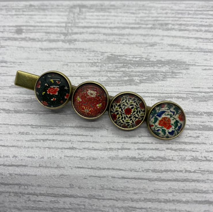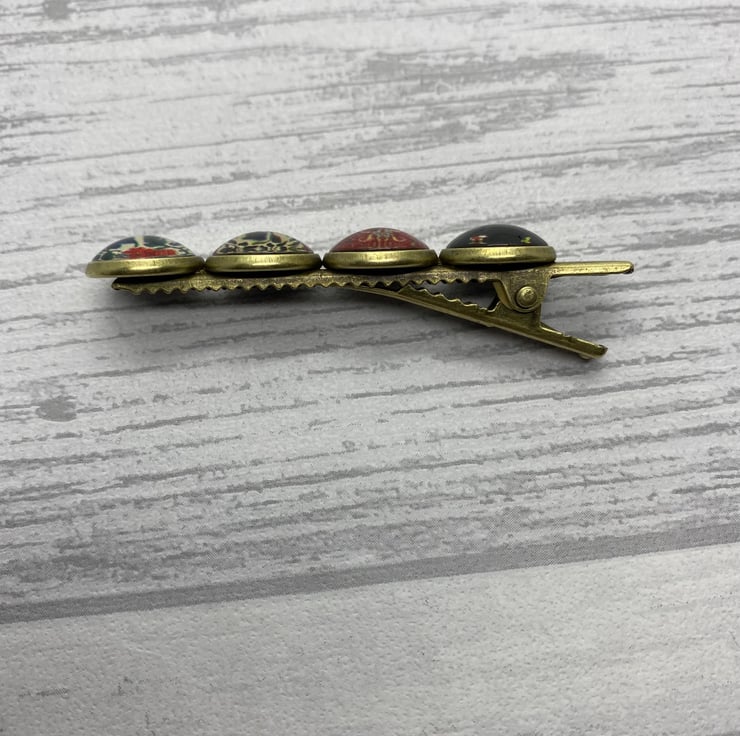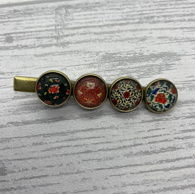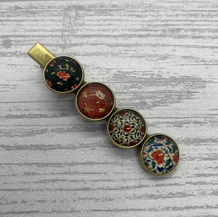 This is a beautiful hair clip / hair slide with four glass cabochons set on a bronze tone alligator clip. The cabochons have a traditional floral designs in dark shades of reds and blues.