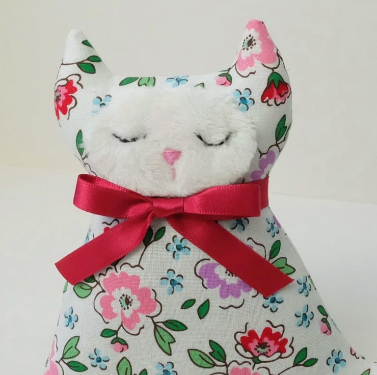 The cat is filled with scoops of fresh organic lavender and toy stuffing for a firm shape. The scent lasts a long time and you only need to squeeze the cat to release the scent, or you can add lavender drops too. I've hand sewn a soft ivory plush fabric face and stitched eyes in black and a nose in pink embroidery thread, then added a pretty red satin ribbon bow around the cat's neck.