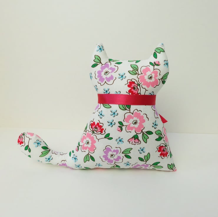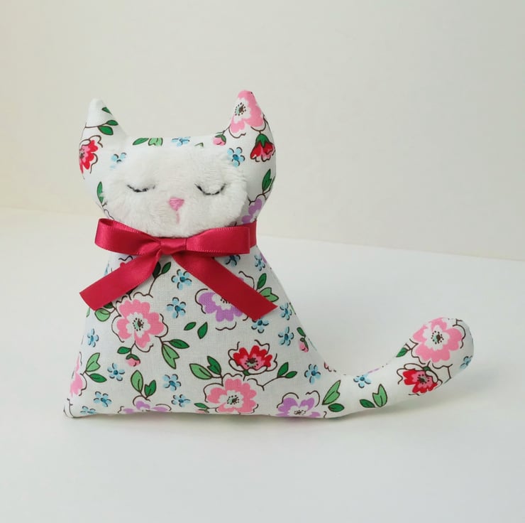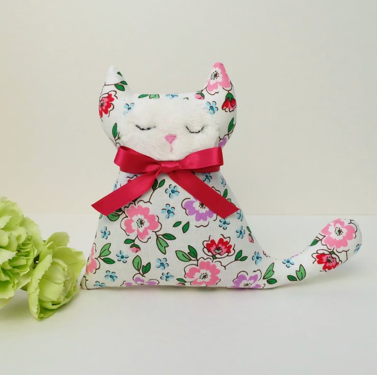 This lavender cat is made using a beautiful, vintage style floral fabric, with flowers in pink, red, purple and blue on a cream ground. Place the cat into bedroom drawers to sweetly scent clothes, or sit it on a pillow to help you have a restful night's sleep.