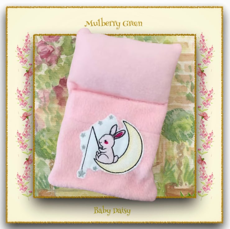 A really cosy little pink sleeping bag for baby Daisy. The sleeping bag is handmade from warm baby pink fleece and is embroidered with baby Daisy’s Bunny Hugs toy sitting on the moon, surrounded by stars. It is just the thing you need for bedtime or popping baby Daisy in for a little nap during the day.