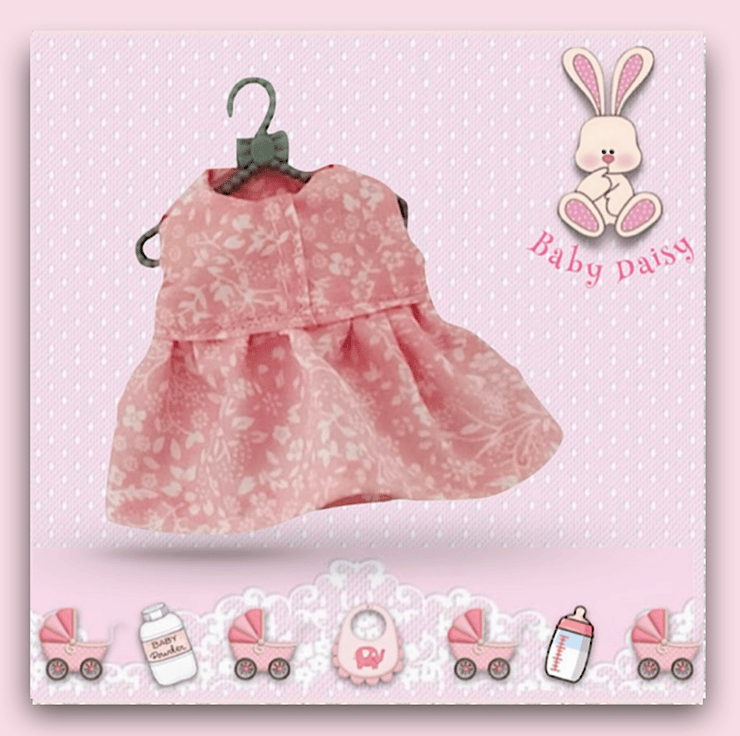 A pretty little pink and white flowered dress for baby Daisy. The dress is handmade from best quality cotton, has a lined bodice and fastens at the back with a little popper