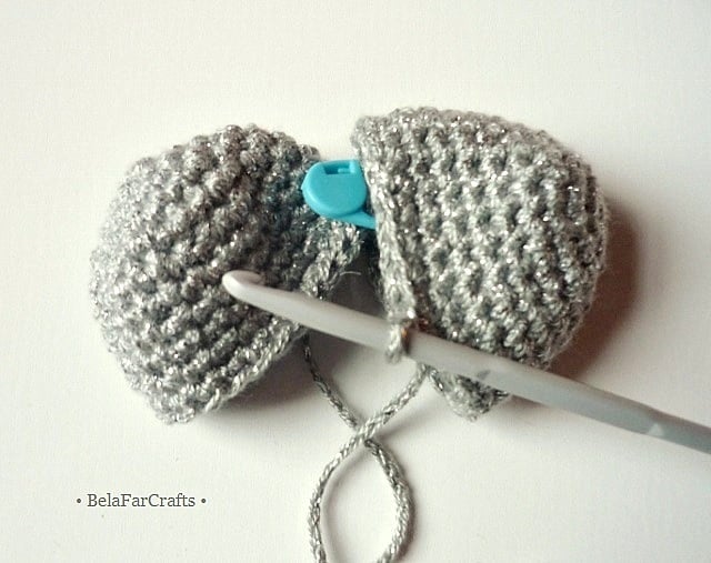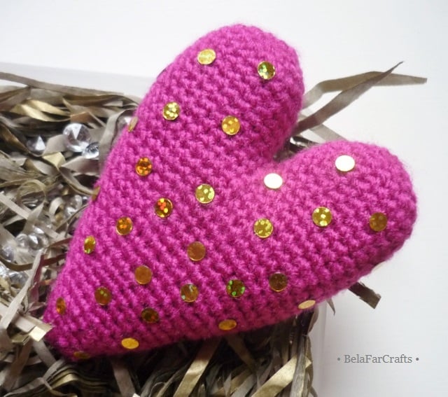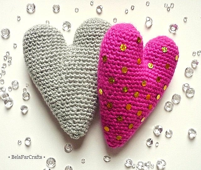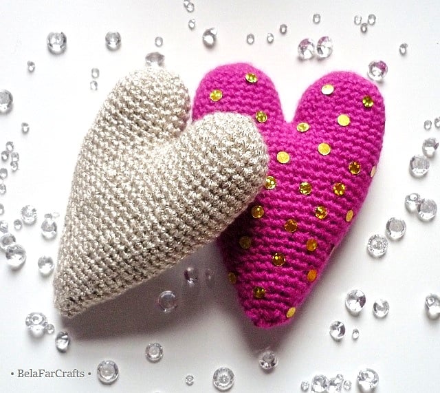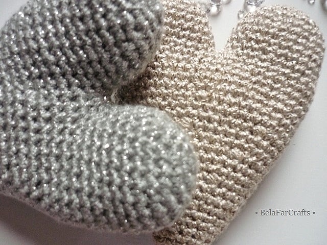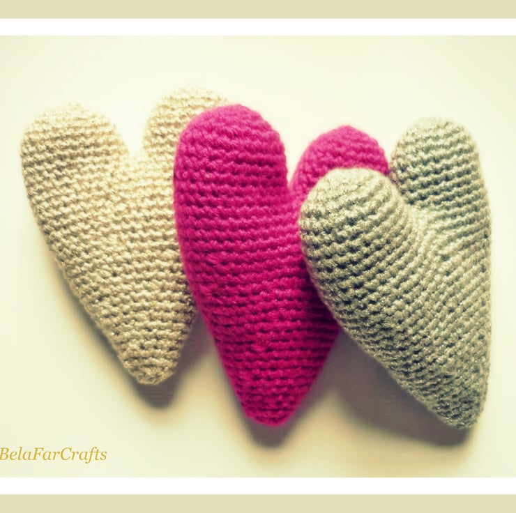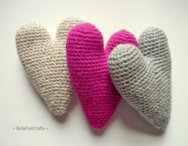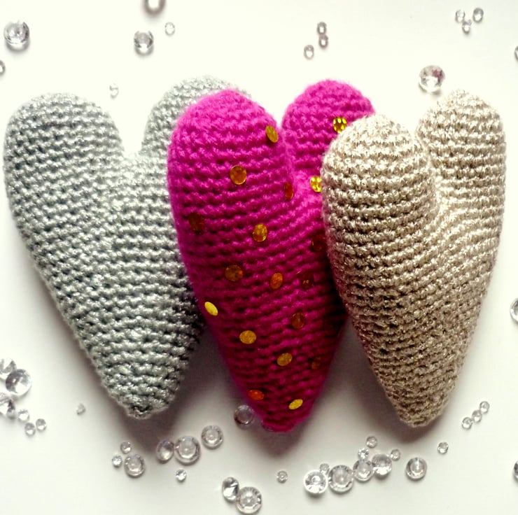 I used acrylic/metallic yarn for the silver and gold hearts and shiny sequins, on one side of the fuchsia heart, for a touch of glamour. I filled them with CE toy filling, 100% hi-loft polyester, that meets safety standards. They measure about 11.5cm (4.5in) long and 8cm (3in) wide.